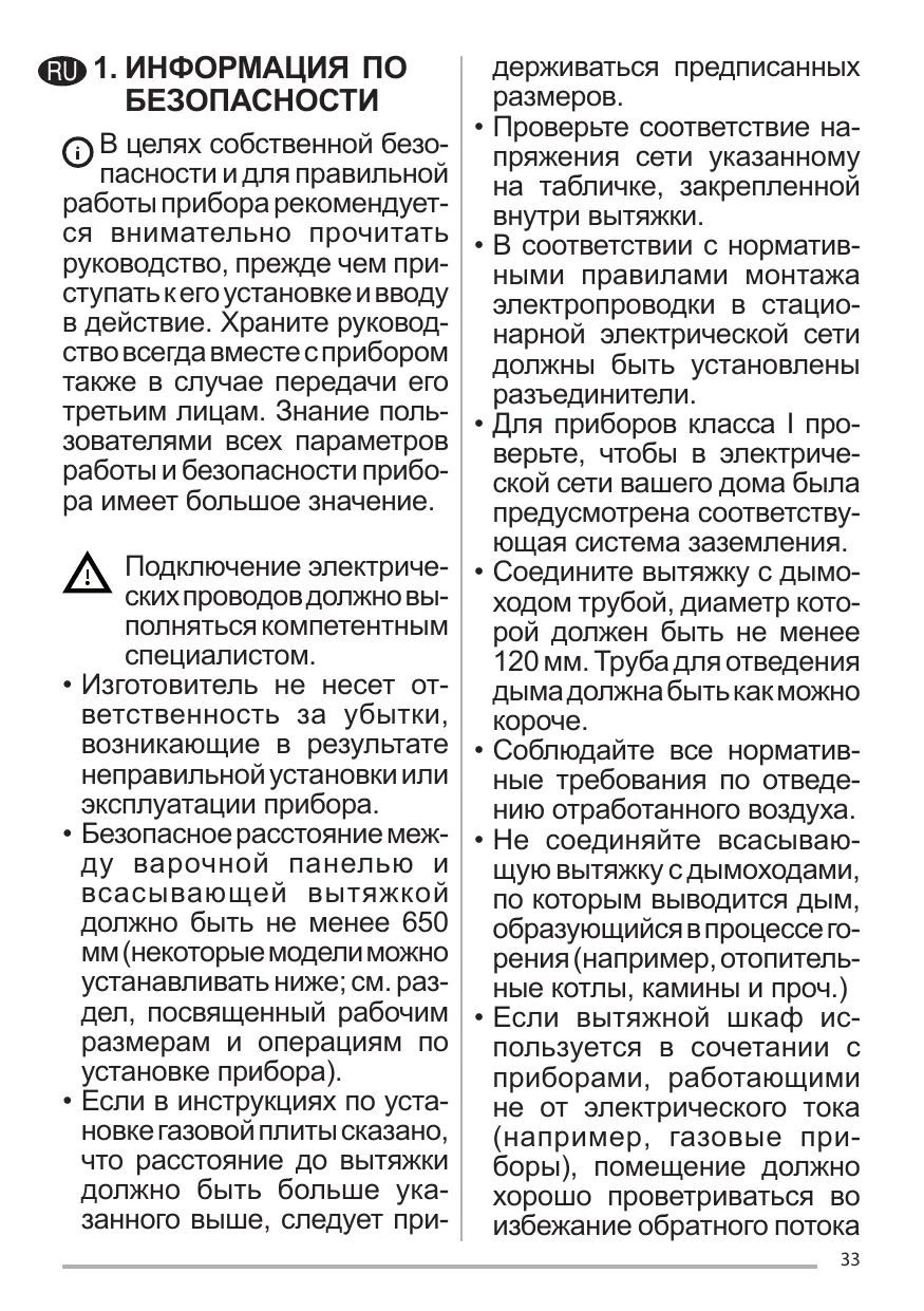 Para los aparatos de la clase I, compruebe que el suministro de corriente eléctrica de la casa tiene una conexión a tierra adecuada. Conecte la campana a la chimenea con un tubo de un diámetro mínimo de 120 mm. El trayecto de humos debe ser lo más corto posible. Deben observarse todas las normas relativas al escape de aire. No conecte la campana extractora a los conductos de humos de combustión (p. ej. calderas, chimeneas, etc.). Si la campana se utiliza en combinación con equipos no eléctricos (por ejemplo, aparatos de gas), debe asegurarse un grado suficiente de ventilación en el local para evitar el retorno del flujo de gases de escape. Cuando la campana extractora se utiliza en combinación con aparatos no eléctricos, la presión negativa en el local no debe ser superior a 0,04 mbar para evitar que los humos vuelvan al local a través de la campana extractora. El aire no debe descargarse a través de un conducto utilizado para los gases de combustión procedentes de aparatos de combustión de gas u otros combustibles. Si el cable de alimentación está dañado, debe ser reemplazado 21