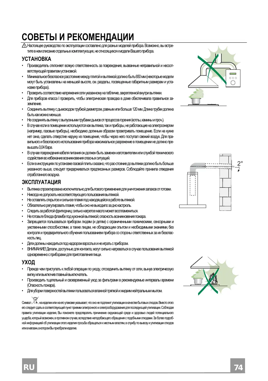• Pour les Appareils appartenant à la Ière Classe, veiller à ce que la mise à la terre de l’installation électrique domestique ait été effectuée conformément aux normes en vigueur. • Connecter la hotte à la sortie d’air aspiré à l’aide d’une tuyauterie d’un diamètre égal ou supérieur à 120 mm. Le parcours de la tuyauterie doit être le plus court possible. • Ne pas connecter la hotte à des conduites d’évacuation de fumées issues d’une combustion tel que (Chaudière, cheminée, etc…). • Si vous utilisez des appareils qui ne fonctionnent pas à l’électricité dans la pièce ou est installée la hotte (par exemple: des appareils fonctionnant au gaz), vous devez prévoir une aération suffisante du milieu. Si la cuisine en est dépourvue, pratiquez une ouverture qui communique avec l’extérieur pour garantir l’infiltration de l’air pur. Pour un emploi correct et sans risque, la dépression maximum dans la pièce ne doit pas dépasser 0,04 mbar. • En cas d’endommagement du cordon d’alimentation, faites-le remplacer par le constructeur ou par le service après-vente, afin de prévenir tout risque. • Si les instructions de montage pour la plaque de cuisson au gaz spécifient une plus grande distance indiquée cidessus, cela doit être pris en compte. Règlement concernant l'évacuation d'air doivent être remplies..