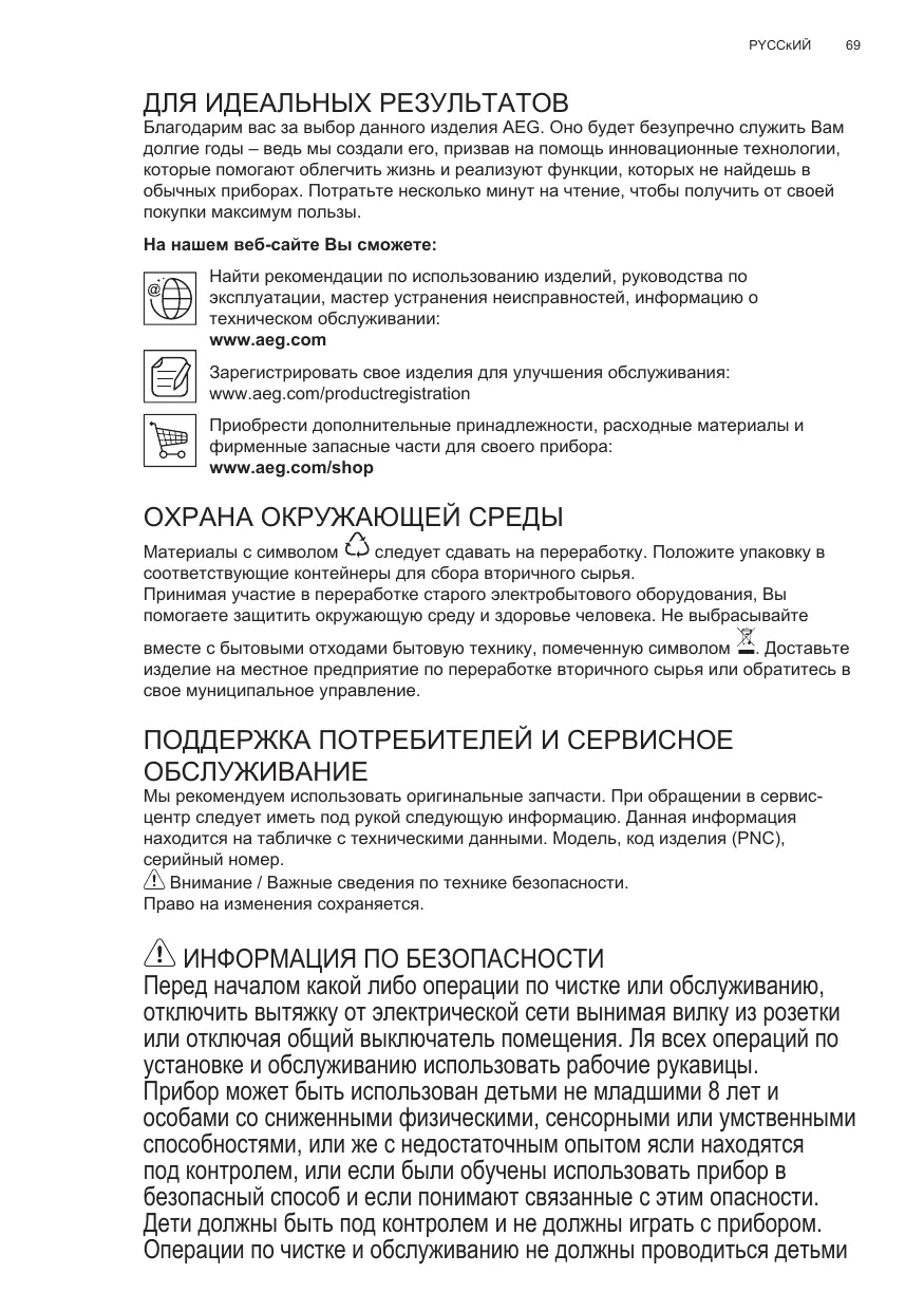 Благодарим вас за выбор данного изделия AEG. Оно будет безупречно служить Вам долгие годы – ведь мы создали его, призвав на помощь инновационные технологии, которые помогают облегчить жизнь и реализуют функции, которых не найдешь в обычных приборах. Потратьте несколько минут на чтение, чтобы получить от своей покупки максимум пользы. На нашем веб-сайте Вы сможете: Найти рекомендации по использованию изделий, руководства по эксплуатации, мастер устранения неисправностей, информацию о техническом обслуживании: www.aeg.com Зарегистрировать свое изделия для улучшения обслуживания: www.aeg.com/productregistration Приобрести дополнительные принадлежности, расходные материалы и фирменные запасные части для своего прибора: www.aeg.com/shop