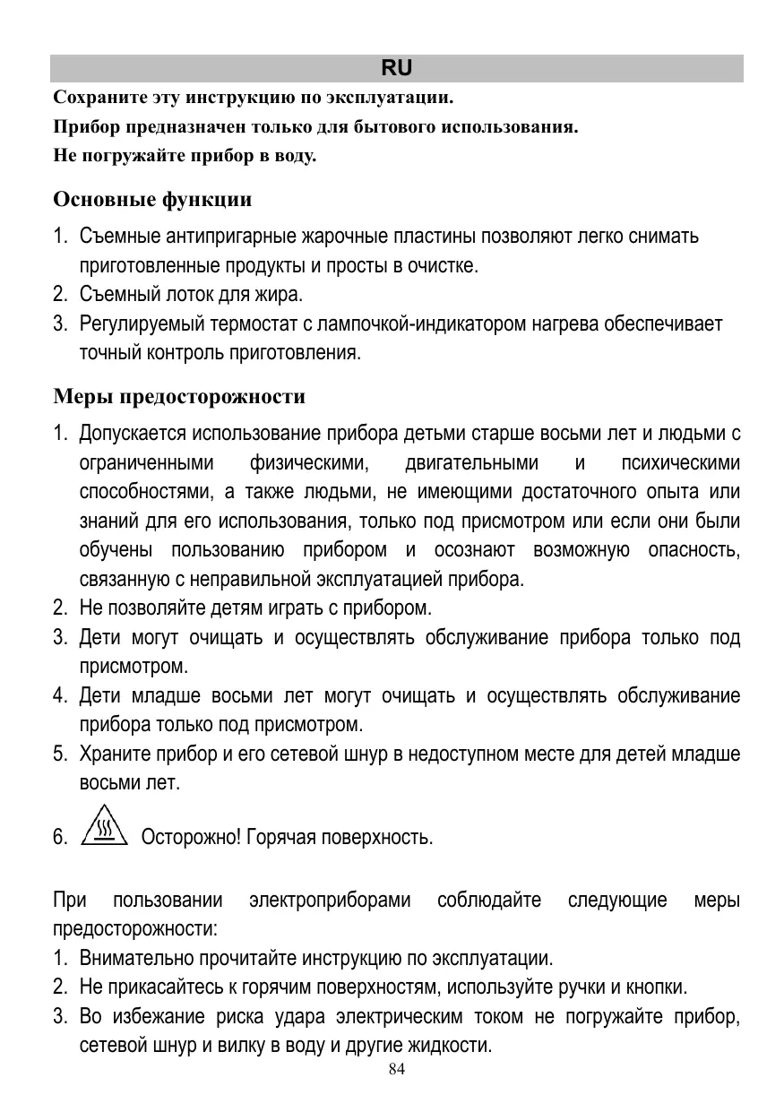 При пользовании электроприборами соблюдайте следующие меры предосторожности: 1. Внимательно прочитайте инструкцию по эксплуатации. 2. Не прикасайтесь к горячим поверхностям, используйте ручки и кнопки. 3. Во избежание риска удара электрическим током не погружайте прибор, сетевой шнур и вилку в воду и другие жидкости. 84