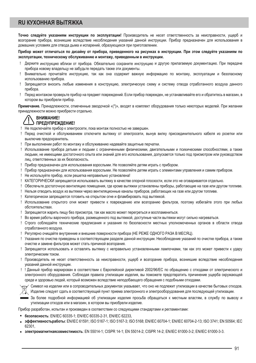 ! ! Cet appareil n’est pas prévu pour les enfants ou les personnes à capacités physiques, sensorielles ou mentales réduites ou manquant d’expérience et de connaissances. Elles ne pourront l’utiliser que sous la surveillance d'un adulte responsable de leur sécurité et après avoir été mises au courant de son fonctionnement. La hotte est prévue pour des adultes. Surveillez les enfants afin qu’ils ne jouent pas avec l’appareil ou avec ses commandes. Ne mettez jamais la hotte en marche si la grille n'est pas bien en place. Ne déposez AUCUN objet sur la hotte sauf si cela est expressément autorisé. Quand la hotte fonctionne en même temps que d'autres appareils à gaz ou autres combustibles, la cuisine doit disposer d'une ventilation suffisante. L'air aspiré par la hotte ne doit jamais être expulsé dans le conduit d’évacuation des fumées de combustion dégagées par des appareils fonctionnant au gaz ou autres combustibles. Il est formellement interdit de flamber les aliments sous la hotte. Évitez de laisser brûler une flamme nue sous la hotte, car cela peut endommager les filtres et provoquer un incendie. Surveillez vos fritures en permanence, car la graisse ou l’huile surchauffée peut prendre feu. Les parties accessibles de la hotte peuvent devenir assez chaudes quand les appareils de cuisson sont en marche. En ce qui concerne les mesures techniques de sécurité pour l'évacuation des fumées, respectez strictement les réglementations et normes en vigueur dans votre pays. La hotte doit être régulièrement nettoyée, aussi bien à l'intérieur qu'à l'extérieur (AU MOINS UNE FOIS PAR MOIS), et ceci en respectant les instructions d'entretien fournies dans ce manuel. Le non-respect des consignes concernant le nettoyage de la hotte ainsi que le remplacement et le nettoyage des filtres peut entraîner un risque d'incendie. Afin d'éviter tout risque de choc électrique, n'utilisez pas la hotte si les lampes ne sont pas bien en place. Nous déclinons toute responsabilité pour tout dysfonctionnement, dommage ou incendie résultant du non-respect des consignes figurant dans cette notice. Ce symbole figure sur le produit ou sur son emballage en application de la directive européenne 2002/96/CE sur les Déchets d’Équipement Électrique et Électronique (DEEE). Cette directive sert de règlement cadre à la reprise, au recyclage et à la valorisation des appareils usagés dans toute l’Europe. Ce produit doit donc faire l’objet d’une collecte sélective. Lorsque vous ne l’utiliserez plus, remettez-le à un service de ramassage spécialisé ou à une déchèterie qui traite les DEEE ; vous contribuerez ainsi à éviter des conséquences néfastes pour la santé et l'environnement. Pour tout renseignement sur la mise au rebut et le recyclage de ce produit, veuillez contacter la mairie ou le service de la propreté de votre commune, ou encore le magasin dans lequel vous l'avez acheté.