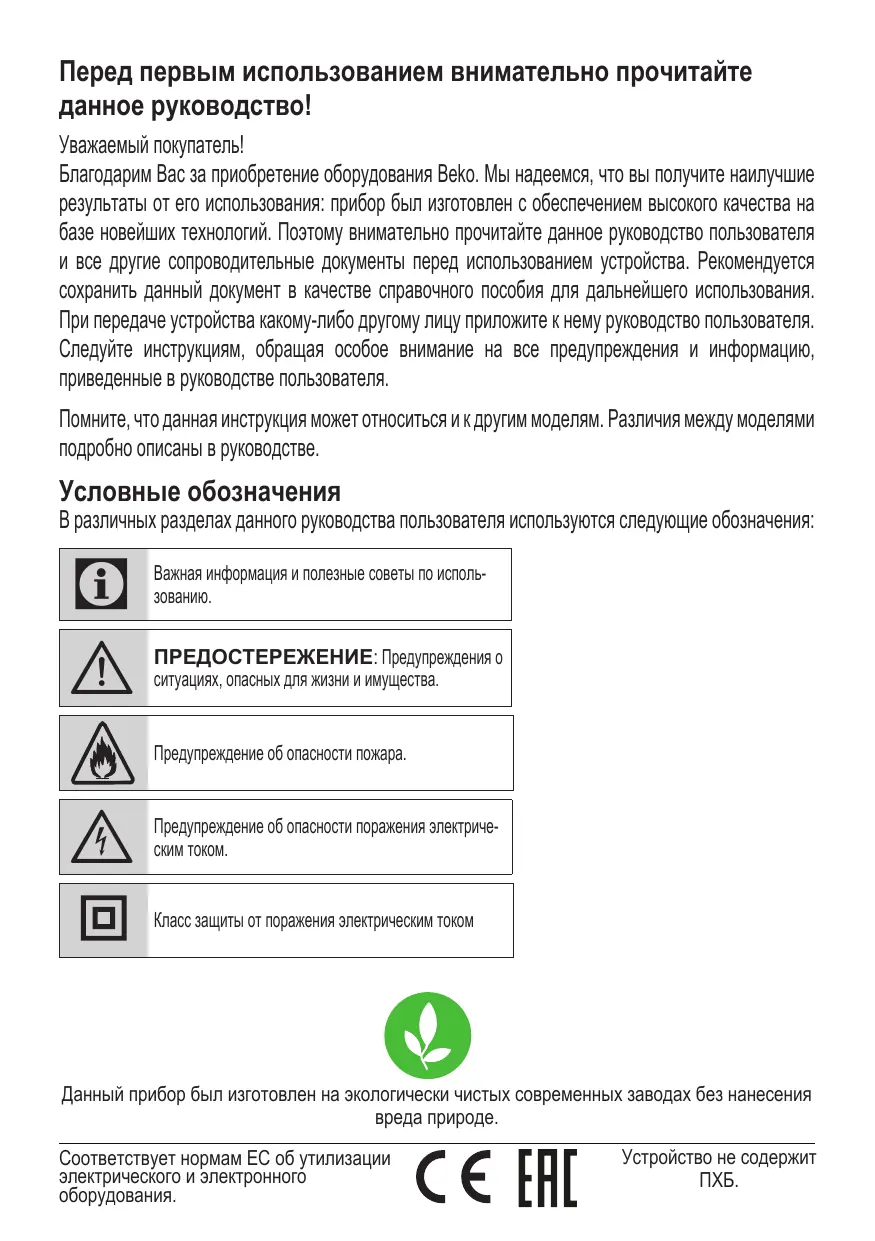 Перед первым использованием внимательно прочитайте данное руководство! Уважаемый покупатель! Благодарим Вас за приобретение оборудования Beko. Мы надеемся, что вы получите наилучшие результаты от его использования: прибор был изготовлен с обеспечением высокого качества на базе новейших технологий. Поэтому внимательно прочитайте данное руководство пользователя и все другие сопроводительные документы перед использованием устройства. Рекомендуется сохранить данный документ в качестве справочного пособия для дальнейшего использования. При передаче устройства какому-либо другому лицу приложите к нему руководство пользователя. Следуйте инструкциям, обращая особое внимание на все предупреждения и информацию, приведенные в руководстве пользователя. Помните, что данная инструкция может относиться и к другим моделям. Различия между моделями подробно описаны в руководстве.