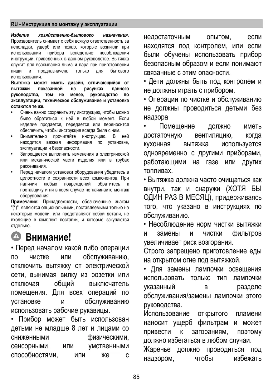 Внимание! • Перед началом какой либо операции по чистке или обслуживанию, отключить вытяжку от электрической сети, вынимая вилку из розетки или отключая общий выключатель помещения. Для всех операций по установке и обслуживанию использовать рабочие рукавицы. • Прибор может быть использован детьми не младше 8 лет и лицами со сниженными физическими, сенсорными или умственными способностями, или же с 85
