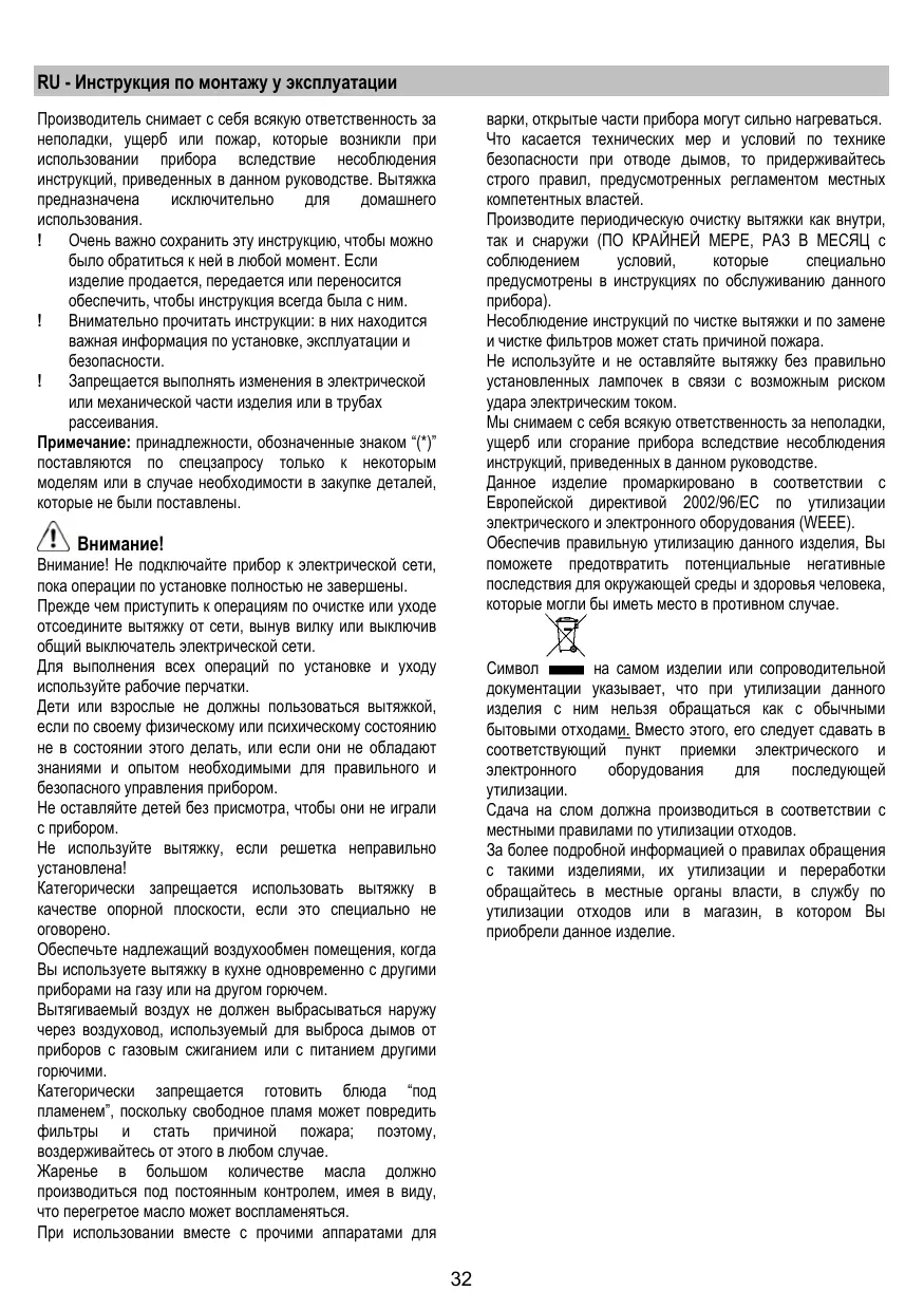 варки, открытые части прибора могут сильно нагреваться. Что касается технических мер и условий по технике безопасности при отводе дымов, то придерживайтесь строго правил, предусмотренных регламентом местных компетентных властей. Производите периодическую очистку вытяжки как внутри, так и снаружи (ПО КРАЙНЕЙ МЕРЕ, РАЗ В МЕСЯЦ с соблюдением условий, которые специально предусмотрены в инструкциях по обслуживанию данного прибора). Несоблюдение инструкций по чистке вытяжки и по замене и чистке фильтров может стать причиной пожара. Не используйте и не оставляйте вытяжку без правильно установленных лампочек в связи с возможным риском удара электрическим током. Мы снимаем с себя всякую ответственность за неполадки, ущерб или сгорание прибора вследствие несоблюдения инструкций, приведенных в данном руководстве. Данное изделие промаркировано в соответствии с Европейской директивой 2002/96/EC по утилизации электрического и электронного оборудования (WEEE). Обеспечив правильную утилизацию данного изделия, Вы поможете предотвратить потенциальные негативные последствия для окружающей среды и здоровья человека, которые могли бы иметь место в противном случае.