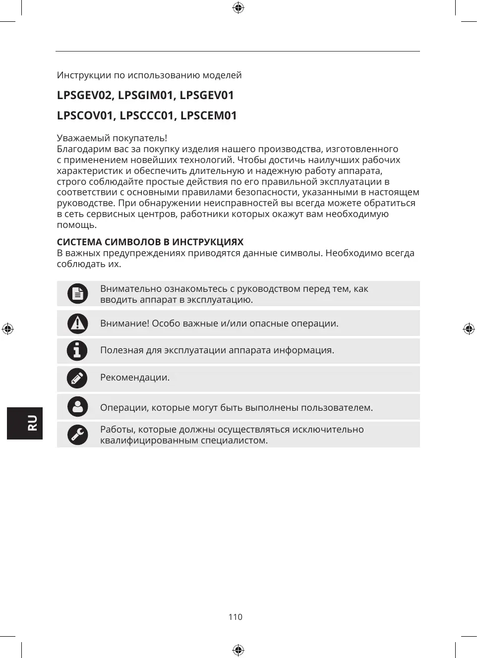 Уважаемый покупатель! Благодарим вас за покупку изделия нашего производства, изготовленного с применением новейших технологий. Чтобы достичь наилучших рабочих характеристик и обеспечить длительную и надежную работу аппарата, строго соблюдайте простые действия по его правильной эксплуатации в соответствии с основными правилами безопасности, указанными в настоящем руководстве. При обнаружении неисправностей вы всегда можете обратиться в сеть сервисных центров, работники которых окажут вам необходимую СИСТЕМА СИМВОЛОВ В ИНСТРУКЦИЯХ В важных предупреждениях приводятся данные символы. Необходимо всегда соблюдать их. Внимательно ознакомьтесь с руководством перед тем, как вводить аппарат в эксплуатацию. Внимание! Особо важные и/или опасные операции. Полезная для эксплуатации аппарата информация. Рекомендации.