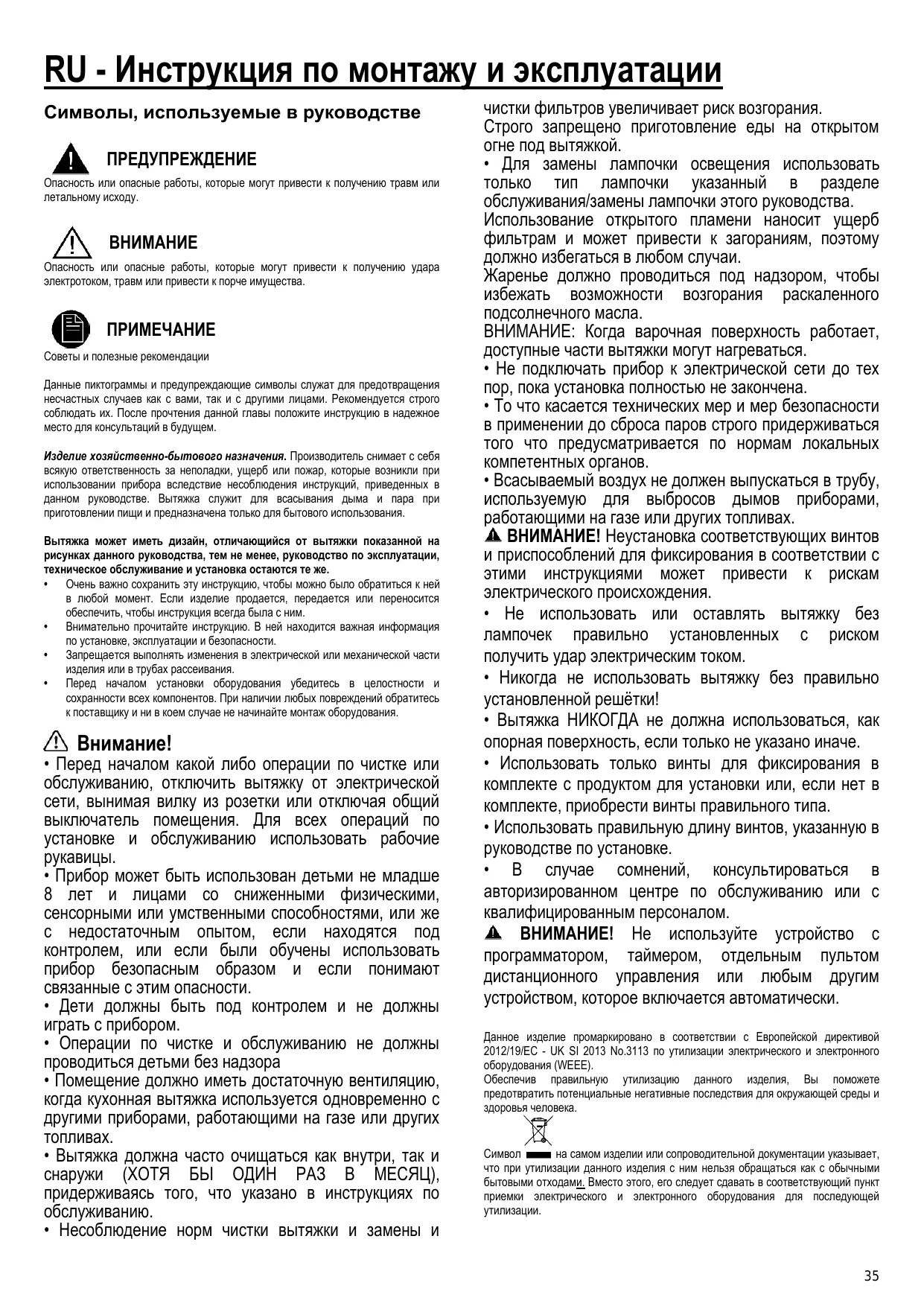 чистки фильтров увеличивает риск возгорания. Строго запрещено приготовление еды на открытом огне под вытяжкой. • Для замены лампочки освещения использовать только тип лампочки указанный в разделе обслуживания/замены лампочки этого руководства. Использование открытого пламени наносит ущерб фильтрам и может привести к загораниям, поэтому должно избегаться в любом случаи. Жаренье должно проводиться под надзором, чтобы избежать возможности возгорания раскаленного подсолнечного масла. ВНИМАНИЕ: Когда варочная поверхность работает, доступные части вытяжки могут нагреваться. • Не подключать прибор к электрической сети до тех пор, пока установка полностью не закончена. • То что касается технических мер и мер безопасности в применении до сброса паров строго придерживаться того что предусматривается по нормам локальных компетентных органов. • Всасываемый воздух не должен выпускаться в трубу, используемую для выбросов дымов приборами, работающими на газе или других топливах. ВНИМАНИЕ! Неустановка соответствующих винтов и приспособлений для фиксирования в соответствии с этими инструкциями может привести к рискам электрического происхождения. • Не использовать или оставлять вытяжку без лампочек правильно установленных с риском получить удар электрическим током. • Никогда не использовать вытяжку без правильно установленной решётки! • Вытяжка НИКОГДА не должна использоваться, как опорная поверхность, если только не указано иначе. • Использовать только винты для фиксирования в комплекте с продуктом для установки или, если нет в комплекте, приобрести винты правильного типа. • Использовать правильную длину винтов, указанную в руководстве по установке. • В случае сомнений, консультироваться в авторизированном центре по обслуживанию или с квалифицированным персоналом. ВНИМАНИЕ! Не используйте устройство с программатором, таймером, отдельным пультом дистанционного управления или любым другим устройством, которое включается автоматически. Данное изделие промаркировано в соответствии с Европейской директивой 2012/19/EC - UK SI 2013 No.3113 по утилизации электрического и электронного оборудования (WEEE). Обеспечив правильную утилизацию данного изделия, Вы поможете предотвратить потенциальные негативные последствия для окружающей среды и здоровья человека.