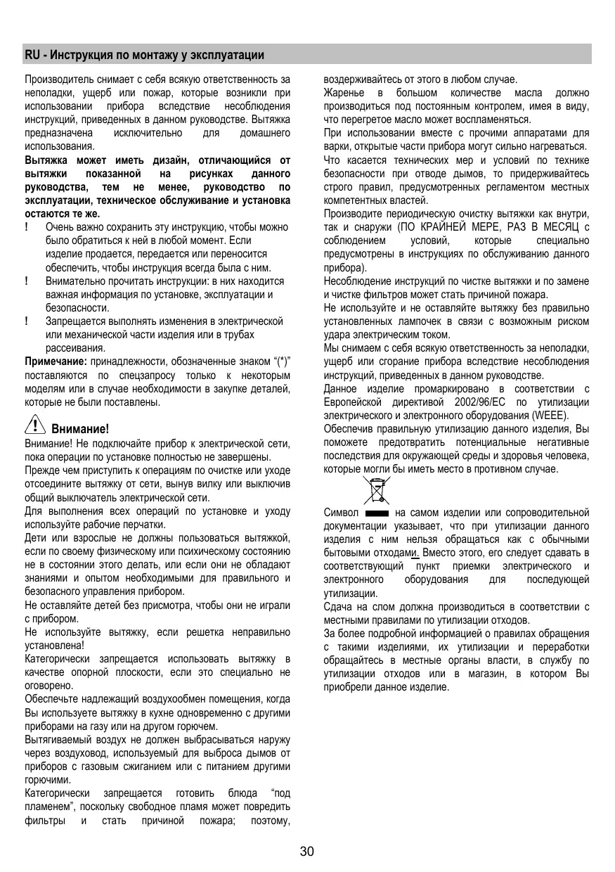 Les pièces accessibles peuvent se réchauffer de façon importante quand elles sont utilisées avec des appareils pour la cuisson. En ce qui concerne les mesures techniques et de sécurité à adopter pour l’évacuation des fumées, s’en tenir strictement à ce qui est prévu dans les règlements des autorités locales compétentes. La hotte doit être régulièrement nettoyée, aussi bien à l’intérieur qu’à l’extérieur (AU MOINS UNE FOIS PAR MOIS, respecter néanmoins les instructions relatives à l’entretien fournies dans ce manuel). La non observation de ces normes de nettoyage de la hotte et du changement et nettoyage des filtres comporte des risques d’incendie. Ne pas utiliser ou laisser la hotte sans que les ampoules soient correctement placées pour éviter tout risque de choc électrique. La société décline toute responsabilité pour d’éventuels inconvénients, dégâts ou incendies provoqués par l’appareil et dérivés de la non observation des instructions reprises dans ce manuel. Cet appareil porte le symbole du recyclage conformément à la Directive Européenne 2002/96/CE concernant les Déchets d’Équipements Électriques et Électroniques (DEEE ou WEEE). En procédant correctement à la mise au rebut de cet appareil, vous contribuerez à empêcher toute conséquence nuisible pour l’environnement et la santé de l’homme.