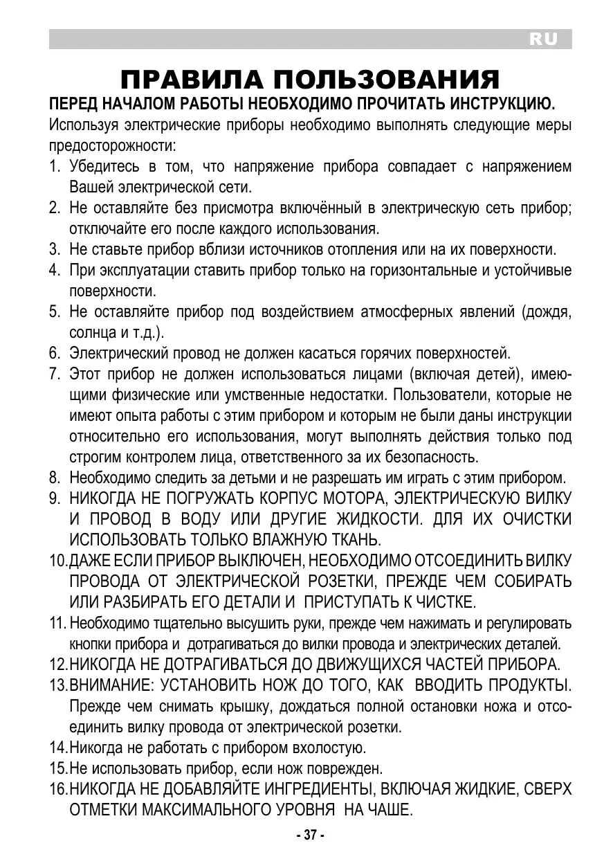 2. Ne laissez jamais l’appareil sans surveillance lorsqu’il est branché au réseau électrique; débranchez-le après chaque utilisation. 3. Ne placez pas l’appareil au dessus ou près de sources de chaleur. 4. Lors de son utilisation, placez l’appareil sur une surface horizontale et stable. 5. N’exposez jamais l’appareil aux agents atmosphériques externes (pluie, soleil, etc.). 6. Veillez à ce que le câble électrique n’entre jamais en contact avec des surfaces chaudes. 7. Cet appareil n’est pas indiqué pour l’utilisation de la part de personnes (y compris les enfants) ayant des capacités physiques, sensorielles ou mentales réduites. Les utilisateurs n’ayant pas l’expérience, une connaissance suffisante de l’appareil ou n’ayant pas reçu les instructions relatives à l’appareil, devront faire l’objet d’un contrôle de supervision de la part d’une personne responsable de leur sécurité. 8. Il est nécessaire de surveiller les enfants pour empêcher qu’ils ne jouent avec l’appareil. 9. NE PAS PLONGER LE CORPS DU PRODUIT, LA FICHE NI LE CABLE ELECTRIQUE DANS L’EAU OU AUTRES LIQUIDES, ET UTILISER TOUJOURS UN CHIFFON HUMIDE POUR LES NETTOYER. 10. MEME LORSQUE L’APPAREIL N’EST PAS EN MARCHE, DEBRANCHER LA FICHE DE LA PRISE DE COURANT ELECTRIQUE AVANT D’INSTALLER OU DE DEFAIRE LES SIMPLES PARTIES OU AVANT DE PROCEDER AU NETTOYAGE. 11. Vérifier d’avoir toujours les mains sèches avant d’utiliser ou de régler les interrupteurs placés sur l’appareil ou avant de manipuler la fiche et les connexions électriques. 12. NE TOUCHEZ JAMAIS LES PARTIES EN MOUVEMENT. 13. ATTENTION: INTRODUIRE LA LAME AVANT LES ALIMENTS. Avant de retirer le couvercle, attendre que la lame soit entièrement arrêtée et débrancher la fiche d’alimentation de la prise de courant. 14. Ne faites pas fonctionner l’appareil à vide. 15. N’utilisez pas l’appareil si la lame est endommagée. - 13 -