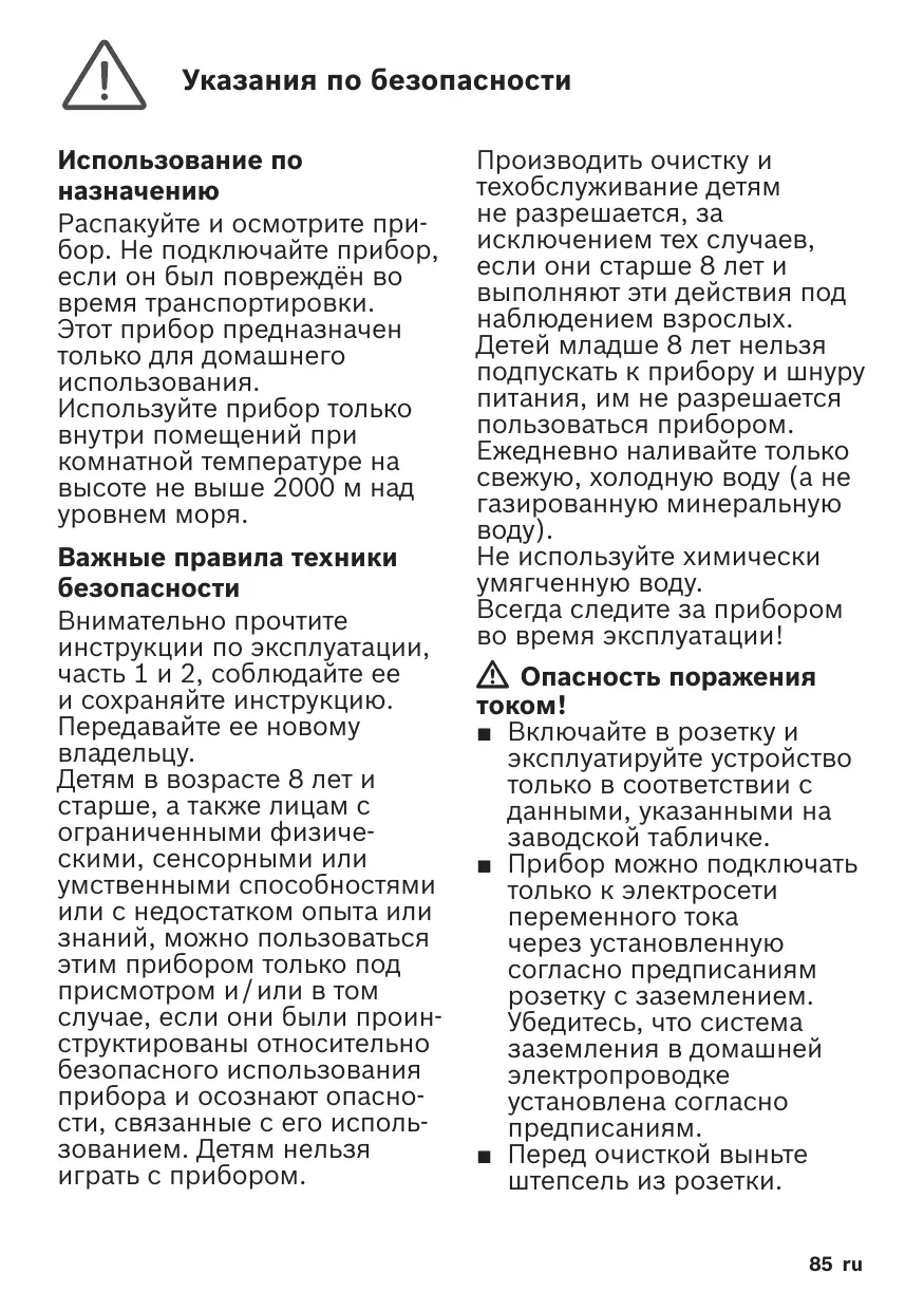 Производить очистку и техобслуживание детям не разрешается, за исключением тех случаев, если они старше 8 лет и выполняют эти действия под наблюдением взрослых. Детей младше 8 лет нельзя подпускать к прибору и шнуру питания, им не разрешается пользоваться прибором. Ежедневно наливайте только свежую, холодную воду (а не газированную минеральную воду). Не используйте химически умягченную воду. Всегда следите за прибором во время эксплуатации! W Опасность поражения током! ■ Включайте в розетку и эксплуатируйте устройство только в соответствии с данными, указанными на заводской табличке. ■ Прибор можно подключать только к электросети переменного тока через установленную согласно предписаниям розетку с заземлением. Убедитесь, что система заземления в домашней электропроводке установлена согласно предписаниям. ■ Перед очисткой выньте штепсель из розетки. 85 ru