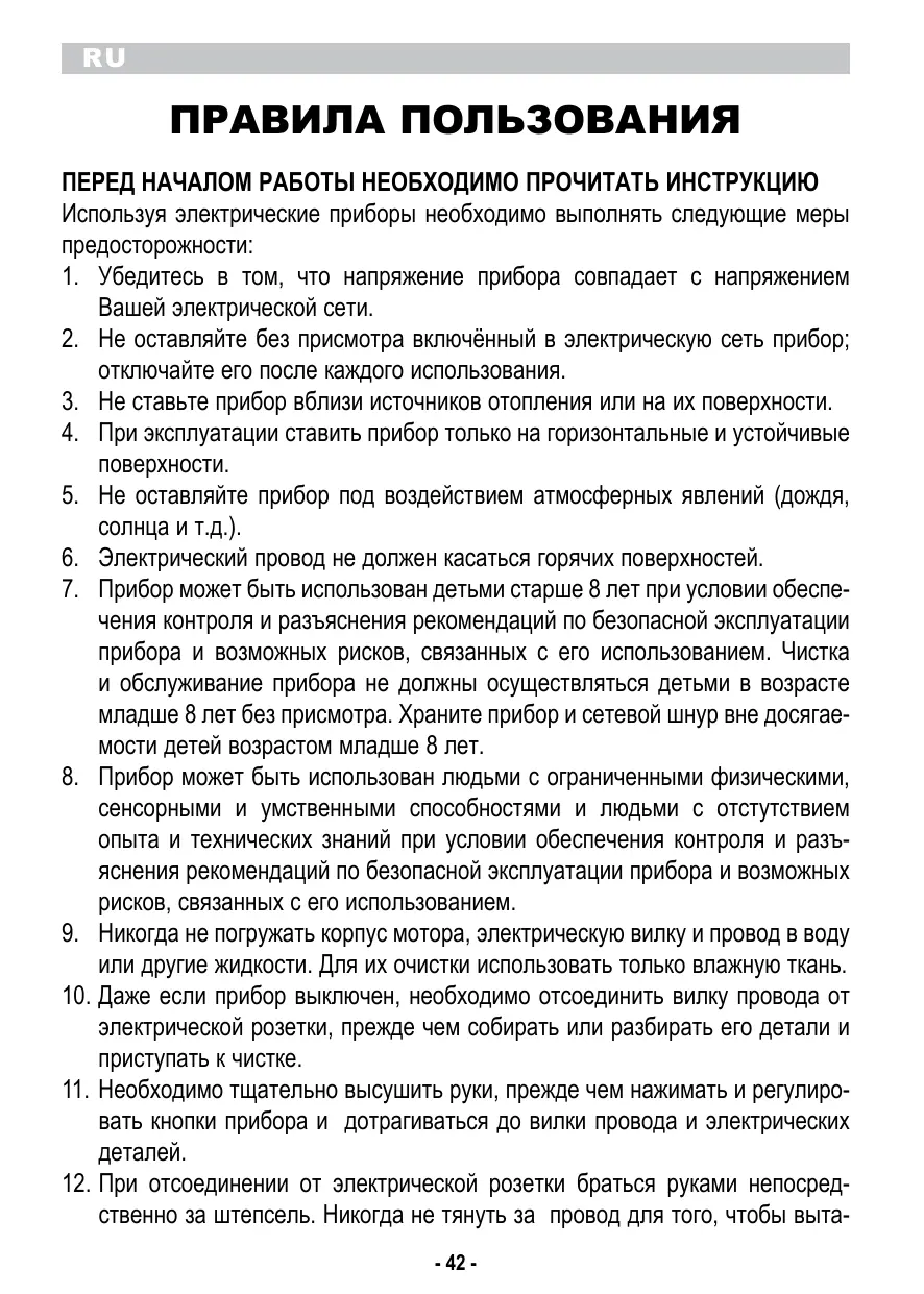 28. N’introduisez jamais vos mains à l’intérieur du récipient pour éviter de vous blesser avec le rouleau. 29. Ne laissez jamais les enfants jouer avec l’appareil. 30. Ne faire tourner l’appareil à vide. 31. N’utilisez pas l’appareil pour hacher des aliments trop durs (ex. les glaçons). 32. Pour éviter de surchauffer l’appareil, respectez le temps de fonctionnement en mode continu de 5 minutes au maximum et attendez qu’il se soit refroidi avant la prochaine utilisation. 33.