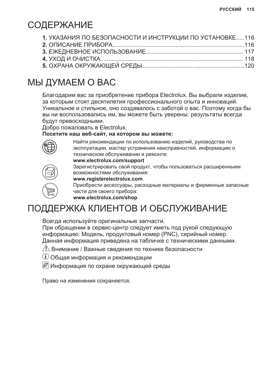 МЫ ДУМАЕМ О ВАС Благодарим вас за приобретение прибора Electrolux. Вы выбрали изделие, за которым стоят десятилетия профессионального опыта и инноваций. Уникальное и стильное, оно создавалось с заботой о вас. Поэтому когда бы вы ни воспользовались им, вы можете быть уверены: результаты всегда будут превосходными. Добро пожаловать в Electrolux. Посетите наш веб-сайт, на котором вы можете: Найти рекомендации по использованию изделий, руководства по эксплуатации, мастер устранения неисправностей, информацию о техническом обслуживании и ремонте: www.electrolux.com/support Зарегистрировать свой продукт, чтобы пользоваться расширенными возможностями обслуживания: www.registerelectrolux.com Приобрести аксессуары, расходные материалы и фирменные запасные части для своего прибора: www.electrolux.com/shop ПОДДЕРЖКА КЛИЕНТОВ И ОБСЛУЖИВАНИЕ Всегда используйте оригинальные запчасти. При обращении в сервис-центр следует иметь под рукой следующую информацию: Модель, продуктовый номер (PNC), серийный номер. Данная информация приведена на табличке с техническими данными. Внимание / Важные сведения по технике безопасности Общая информация и рекомендации Информация по охране окружающей среды Право на изменения сохраняется.
