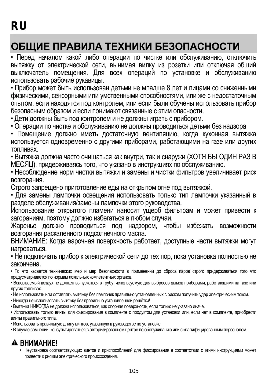 • Les enfants ne doivent pas jouer avec l’appareil. • Le nettoyage et l’entretien par l’usager ne doivent pas être effectués par des enfants sans surveillance. • La pièce doit avoir une aération suffisante lorsque la hotte est utilisée conjointement avec d'autres appareils fonctionnant au gaz ou autres combustibles. • La hotte doit être régulièrement nettoyée à la fois à l'intérieur et à l'extérieur (AU MOINS UNE FOIS PAR MOIS); cela devrait se faire en conformité avec les instructions d'entretien. Le non respect des instructions expressément fournies concernant le nettoyage de la hotte et des filtres peut provoquer des risques d'incendie. • Ne pas flamber d’aliments sous la hotte. • Pour le remplacement de la lampe, utilisez uniquement le type de lampe spécifié dans la section remplacement/maintenance lampe dans ce manuel. L'utilisation d'une flamme nue est dommageable pour les filtres et peut causer un incendie, par conséquent, il est déconseillé de l'utiliser. La friture doit être faite avec soin afin de s’assurer que l’huile surchauffée ne prenne pas feu. AVERTISSEMENT: Lorsque la table de cuisson est en fonctionnement, les parties accessibles de la hotte peuvent devenir très chaudes. • Ne pas brancher l'appareil au réseau électrique avant que l'installation ne soit complètement terminée.