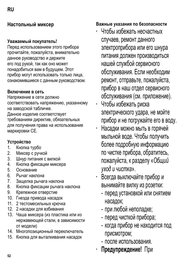 Настольный миксер Уважаемый покупатель! Перед использованием этого прибора прочитайте, пожалуйста, внимательно данное руководство и держите его под рукой, так как оно может понадобиться вам в будущем. Этот прибор могут использовать только лица, ознакомившиеся с данным руководством. Включение в сеть Напряжение в сети должно соответствовать напряжению, указанному на заводской табличке. Данное изделие соответствует требованиям директив, обязательных для получения права на использование маркировки СЕ.