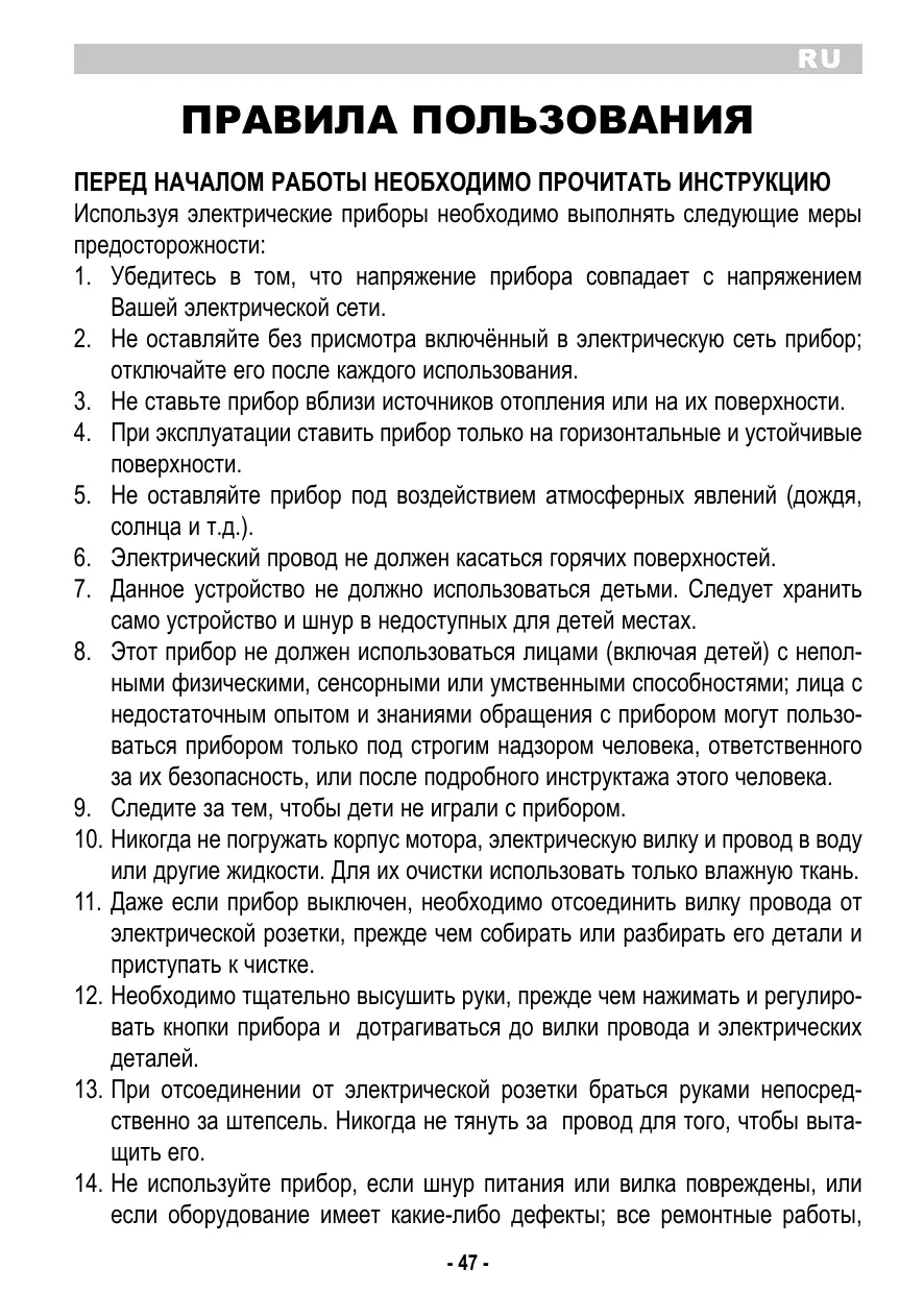 électrique; débranchez-le après chaque utilisation. 3. Ne placez pas l’appareil au dessus ou près de sources de chaleur. 4. Lors de son utilisation, placez l’appareil sur une surface horizontale et stable. 5. N’exposez jamais l’appareil aux agents atmosphériques externes (pluie, soleil, etc.). 6. Veillez à ce que le câble électrique n’entre jamais en contact avec des surfaces chaudes. 7. Cet appareil ne doit pas être utilisé par les enfants. Garder l’appareil et le cordon électrique loin de la portée des enfants. 8. Cet appareil ne doit pas être utilisé par des personnes (y compris les enfants) dont les capacités physiques, sensorielles ou mentales sont réduites, ou par des personnes manquant d’expérience et de connaissance d’appareil, à moins qu’elles ne soient attentivement surveillées et correctement instruites sur l’usage de l’appareil de la part d’une personne responsable de leur sécurité. 9. Vérifiez que les enfant ne jouent pas avec l’appareil. 10. Ne pas plonger le corps du produit, la fiche ni le cable electrique dans l’eau ou autres liquides, et utiliser toujours un chiffon humide pour les nettoyer. 11. Meme lorsque l’appareil n’est pas en marche, debrancher la fiche de la prise de courant electrique avant d’installer ou de defaire les simples parties ou avant de proceder au nettoyage. 12. Vérifier d’avoir toujours les mains sèches avant d’utiliser ou de régler les interrupteurs placés sur l’appareil ou avant de manipuler la fiche et les connexions électriques. 13. Pour débrancher l’appareil, saisir directement la fiche en la débranchant de la prise murale. Ne tirez jamais sur le câble d’alimentation. 14. Ne pas utiliser l’appareil si le cordon electrique ou la fiche sont endommages ou si l’appareil est defectueux; toutes les reparations, y compris la substitution du cordon d’alimentation, doivent etre effectuees exclusivement par le centre de service apres-vente Ariete ou par des techniciens agrees Ariete, de façon a prevenir tout risque de danger. - 13 -
