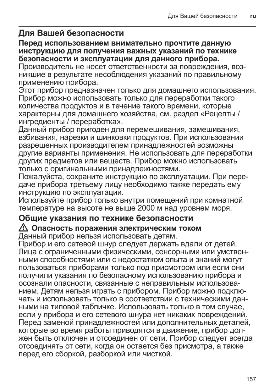 –– 1 œuf –– 1 pincée de sel –– 80 g de sucre –– 60 g de beurre –– Le zeste d’un demi-citron (ou de l’arôme citron) ■■ Versez tous les ingrédients dans le bol mélangeur, sauf le lait. ■■ Réglez le sélecteur rotatif pendant 10 secondes sur une vitesse réduite. ■■ Ajoutez du lait et mélangez à vitesse réduite pendant environ 1 minute et demie. Les ingrédients devront se trouver à la même tempé rature. Une fois que la pâte a acquis un aspect lisse, laissez-la gonfler dans un endroit chaud. Oignons, ail 1 oignon minimum, jusqu’à 300 g, coupé en quatre. 1 gousse d’ail minimum, jusqu’à 300 g ■■ Reduisez jusqu’à obtenir la finesse voulue. ■■ Retirez les os, cartilages, la peau et les tendons. Découpez la viande en dés. Confection des pâtes de viande, des farces et des pâtés : ■■ Dans le bol, versez la viande (de bœuf, cochon, veau, volaille, mais aussi de poisson, etc.) avec les autres ingrédients et épices puis malaxez ces ingrédients jusqu’à obtention d’une pâte.