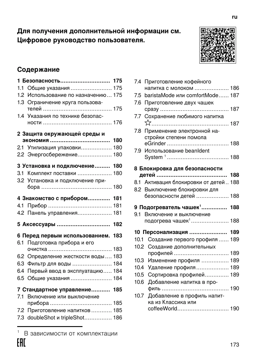 Содержание 1 Безопасность 175 1.1 Общие указания 175 1.2 Использование по назначению... 175 1.3 Ограничение круга пользователей 175 1.4 Указания по технике безопасности 176 2 Защита окружающей среды и экономия 180 2.1 Утилизaция yпaкoвки 180 2.2 Энергосбережение 180 3 Установка и подключение 180 3.1 Комплект поставки 180 3.2 Установка и подключение прибора 180 4 Знакомство с прибором 181 4.1 Прибор 181 4.2 Панель управления 181 5 Аксессуары 182 6 Перед первым использованием. 183 6.1 Подготовка прибора и его очистка 183 6.2 Определение жесткости воды .... 183 6.3 Фильтр для воды 184 6.4 Первый ввод в эксплуатацию 184 6.5 Общие указания 184 7 Стандартное управление 185 7.1 Включение или выключение прибора 185 7.2 Приготовление напитков 185 7.3 doubleShot и tripleShot 186 1