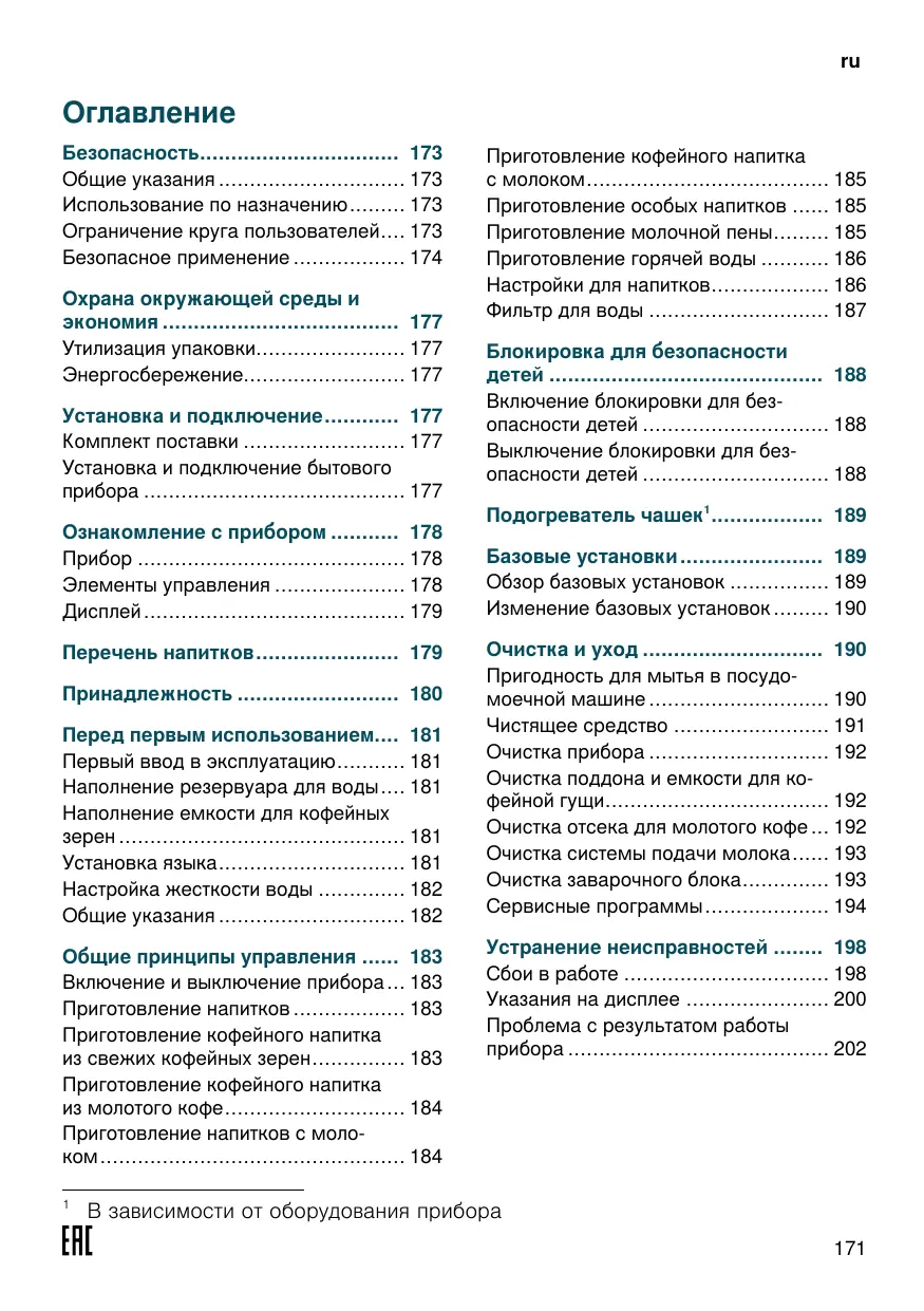 Оглавление Безопасность 173 Общие указания 173 Использование по назначению 173 Ограничение круга пользователей.... 173 Безопасное применение 174 Охрана окружающей среды и экономия 177 Утилизaция yпaкoвки 177 Энергосбережение 177 Установка и подключение 177 Комплект поставки 177 Уcтaнoвкa и пoдключeниe бытoвoгo пpибopa 177 Ознакомление с прибором 178 Прибор 178 Элементы управления 178 Дисплей 179 Перечень напитков 179 Принадлежность 180 Перед первым использованием.... 181 Первый ввод в эксплуатацию 181 Наполнение резервуара для воды.... 181 Наполнение емкости для кофейных зерен 181 Установка языка 181 Настройка жесткости воды 182 Общие указания 182 Общие принципы управления 183 Включение и выключение прибора ... 183 Приготовление напитков 183 Приготовление кофейного напитка из свежих кофейных зерен 183 Приготовление кофейного напитка из молотого кофе 184 Приготовление напитков с молоком 184 1