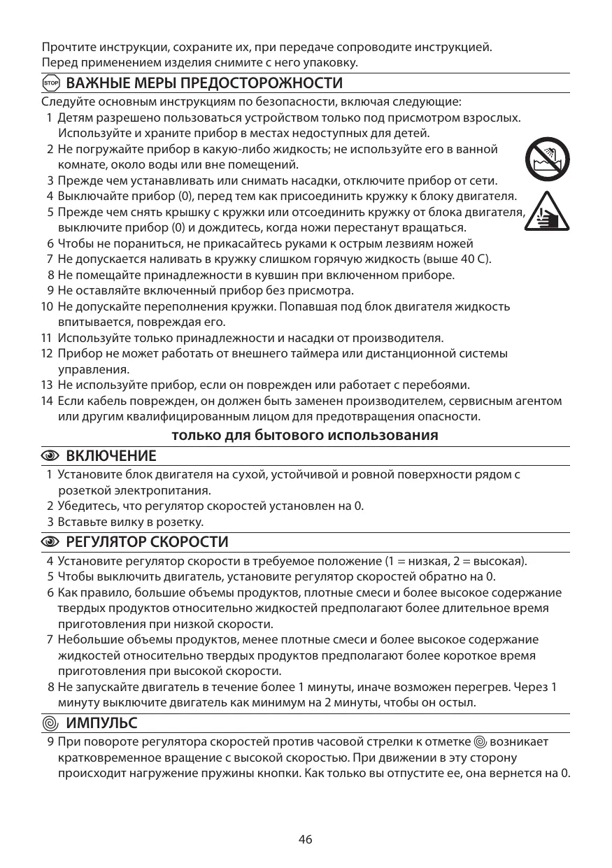43 Éteignez l’appareil (0) et débranchez-le. 44 Essuyez l’extérieur du bloc moteur à l’aide d’un chiffon humide propre. 45 Lavez les parties amovibles dans de l’eau chaude et savonneuse, rincez-les bien, égouttez-les et laissez-les sécher. 46 Faites attention aux lames ; ne les manipulez pas directement, utilisez une brosse en nylon. 47 Ne mettez aucune part de l’appareil dans un lave-vaisselle.