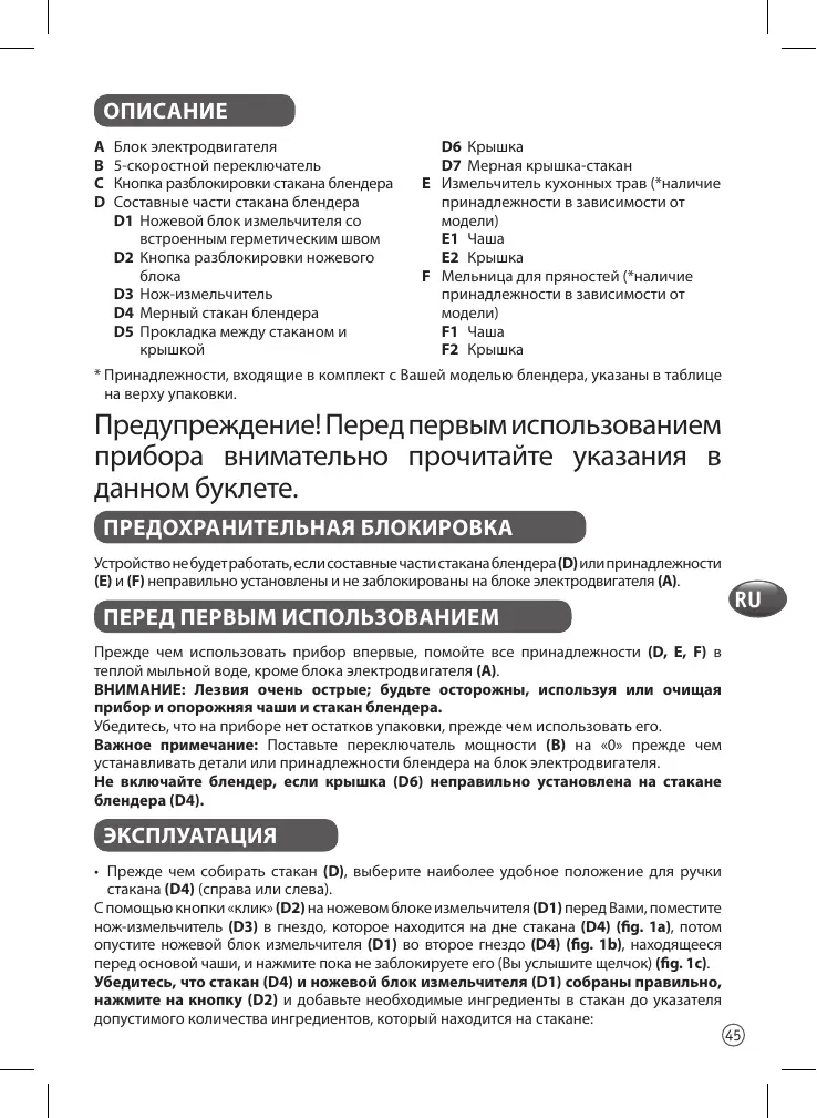 Before using your appliance for the first time, clean all the accessories (D, E, F) in warm water and washing up liquid, except for the motor unit (A).