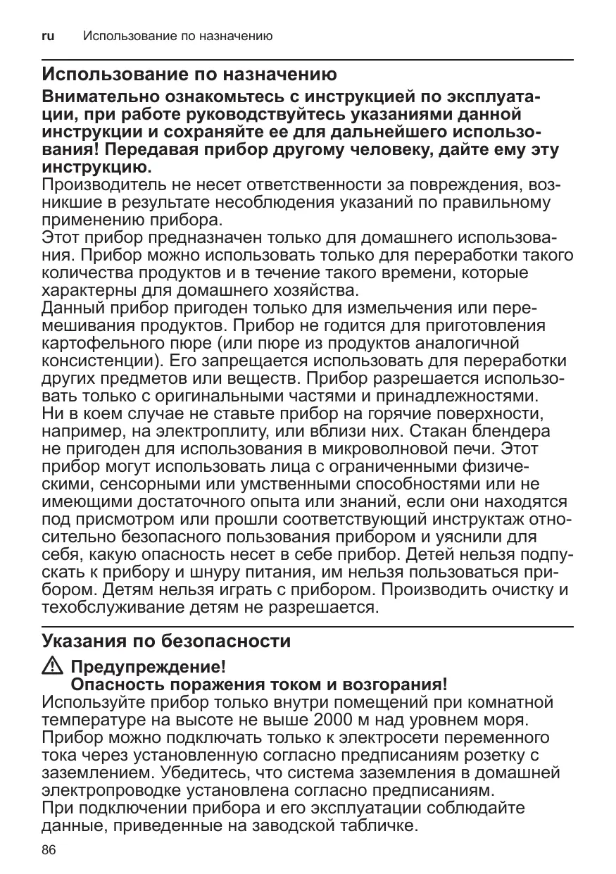 Использование по назначению Использование по назначению Внимательно ознакомьтесь с инструкцией по эксплуатации, при работе руководствуйтесь указаниями данной инструкции и сохраняйте ее для дальнейшего использования! Передавая прибор другому человеку, дайте ему эту инструкцию. Производитель не несет ответственности за повреждения, возникшие в результате несоблюдения указаний по правильному применению прибора. Этот прибор предназначен только для домашнего использования. Прибор можно использовать только для переработки такого количества продуктов и в течение такого времени, которые характерны для домашнего хозяйства. Данный прибор пригоден только для измельчения или перемешивания продуктов. Прибор не годится для приготовления картофельного пюре (или пюре из продуктов аналогичной консистенции). Его запрещается использовать для переработки других предметов или веществ. Прибор разрешается использовать только с оригинальными частями и принадлежностями. Ни в коем случае не ставьте прибор на горячие поверхности, например, на электроплиту, или вблизи них. Стакан блендера не пригоден для использования в микроволновой печи. Этот прибор могут использовать лица с ограниченными физическими, сенсорными или умственными способностями или не имеющими достаточного опыта или знаний, если они находятся под присмотром или прошли соответствующий инструктаж относительно безопасного пользования прибором и уяснили для себя, какую опасность несет в себе прибор. Детей нельзя подпускать к прибору и шнуру питания, им нельзя пользоваться прибором. Детям нельзя играть с прибором. Производить очистку и техобслуживание детям не разрешается. Указания по безопасности W Предупреждение! Опасность поражения током и возгорания! Используйте прибор только внутри помещений при комнатной температуре на высоте не выше 2000 м над уровнем моря. Прибор можно подключать только к электросети переменного тока через установленную согласно предписаниям розетку с заземлением. Убедитесь, что система заземления в домашней электропроводке установлена согласно предписаниям. При подключении прибора и его эксплуатации соблюдайте данные, приведенные на заводской табличке.