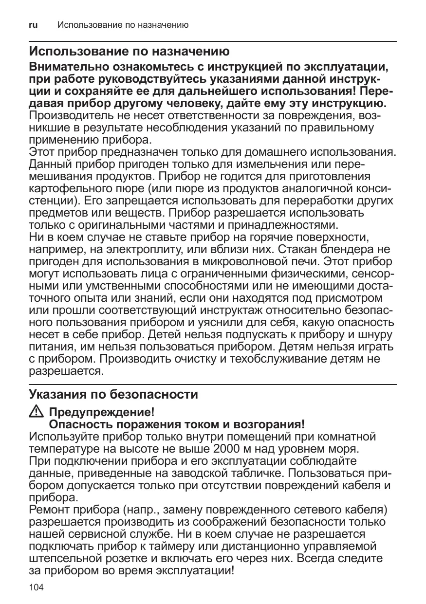 Cet appareil est destiné exclusivement à une utilisation domestique et non professionnelle. L’appareil ne convient que pour broyer et / ou mélanger des produits alimentaires. L’appareil n’est pas adapté pour la préparation de purée de pommes de terre (ou de purées d’aliments de consistance similaire). Il ne doit pas servir à transformer d’autres substances / objets. Utiliser l’appareil avec les pièces et accessoires d’origine uniquement. Ne jamais poser l’appareil sur des surfaces chaudes (tables de cuisson par ex.) ou à proximité de celles-ci. Le bol mixeur ne va pas au four micro-ondes. Cet appareil peut être utilisé par des personnes aux capacités physiques, sensorielles ou mentales réduites ou des personnes inexpérimentées, à condition qu’elles soient surveillées ou qu’elles aient été informées de l’utilisation de l’appareil et qu’elles comprennent les risques inhérents à son usage. Il faut tenir les enfants à l’écart de l’appareil et du cordon de branchement et ne pas leur permettre d’utiliser l’appareil. Ne pas laisser les enfants jouer avec l’appareil. Le nettoyage et l’entretien incombant à l’utilisateur ne doivent pas être effectués par des enfants.
