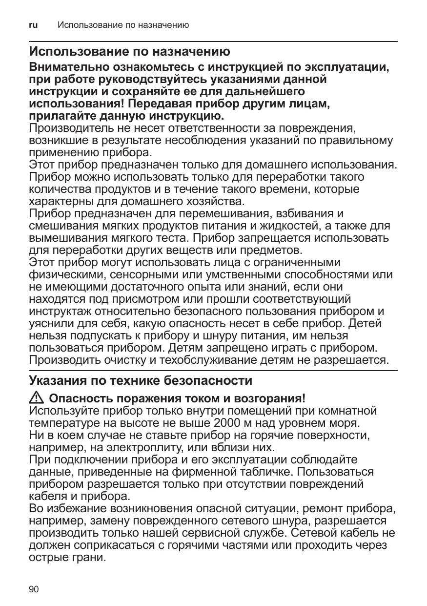 Gerät niemals an Zeitschaltuhren oder fernbedienbaren Steckdosen anschließen. Bei Stromunterbrechung bleibt das Gerät eingeschaltet und läuft nach der Unterbrechung wieder an. Gerät sofort ausschalten. Das Gerät während des Betriebs stets beaufsichtigen! Das Gerät niemals länger eingeschaltet lassen, wie für die Cet appareil est destiné exclusivement à une utilisation domestique et non professionnelle. Utiliser cet appareil uniquement pour des quantités de préparations culinaires courantes et pour des durées de service normales. L’appareil est conçu pour mélanger, battre et mixer des aliments tendres et des liquides ainsi que pour pétrir des pâtes molles. L’appareil ne doit pas servir à transformer d’autres substances ou objets. Cet appareil peut être utilisé par des personnes aux capacités physiques, sensorielles ou mentales réduites ou des personnes inexpérimentées, à condition qu’elles soient surveillées ou qu’elles aient été informées de l’utilisation sûre de l’appareil et qu’elles comprennent les risques inhérents à son usage. Il faut tenir les enfants à l’écart de l’appareil et du cordon de branchement et ne pas leur permettre d’utiliser l’appareil. Ne pas laisser les enfants jouer avec l’appareil. Le nettoyage et l’entretien incombant à l’utilisateur ne doivent pas être effectués par des enfants.