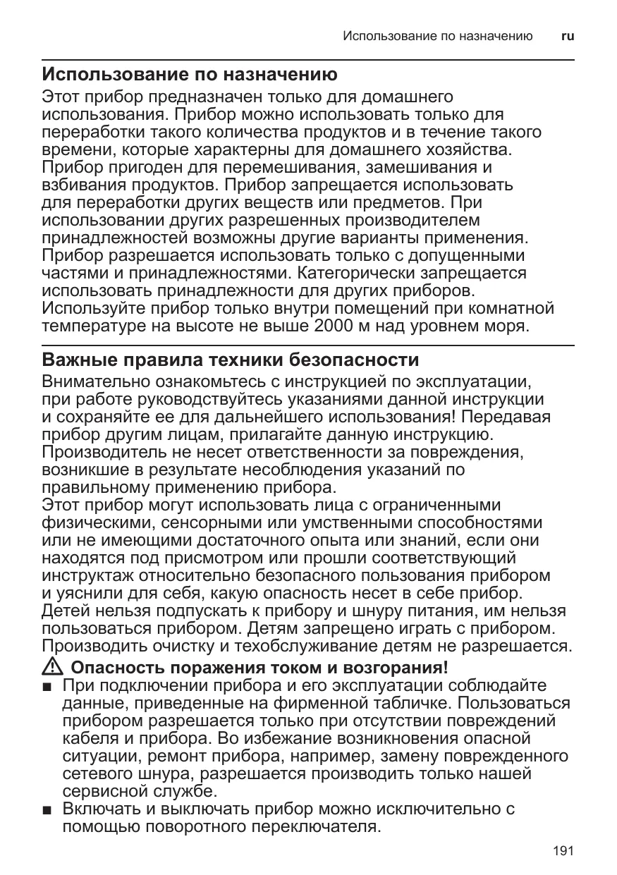 Cet appareil peut être utilisé par des personnes aux capacités physiques, sensorielles ou mentales réduites ou des personnes inexpérimentées, à condition qu’elles soient surveillées ou qu’elles aient été informées de l’utilisation sûre de l’appareil et qu’elles comprennent les risques inhérents à son usage. Il faut tenir les enfants à l’écart de l’appareil et du cordon de branchement et ne pas leur permettre d’utiliser l’appareil. Ne pas laisser les enfants jouer avec l’appareil. Le nettoyage et l’entretien incombant à l’utilisateur ne doivent pas être effectués par des enfants. W Risque de chocs électriques et d’incendie ! ■ Ne brancher et n’utiliser l’appareil que conformément aux indications figurant sur la plaque signalétique. N’utiliser l’appareil que si son cordon d’alimentation et l’appareil lui-même ne présentent aucun dommage. Afin d’écarter tout danger, seul notre service après-vente est habilité à réparer l’appareil, comme par exemple procéder au remplacement d’un cordon d’alimentation endommagé. ■ Allumez et éteignez l’appareil uniquement par l’interrupteur rotatif. 33