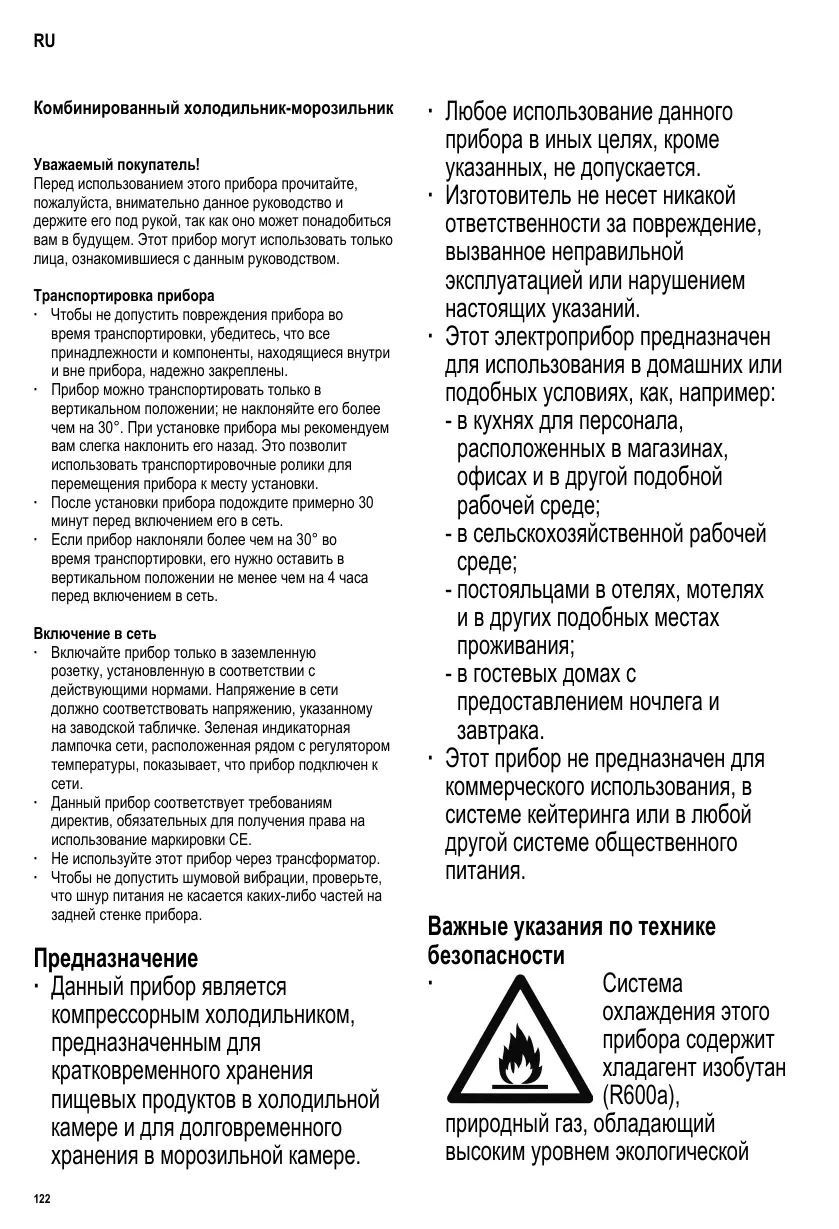 ∙ Cet appareil est destiné à être utilisé dans des applications domestiques et analogues telles que : - des coins cuisines réservés au personnel dans des magasins, bureaux et autres environnements professionnels ; - des fermes ; - l’utilisation par les clients des hôtels, motels et autres environnements à caractère résidentiel ; - des environnements de type chambres d’hôtes. ∙ Cet appareil n’est conçu ni pour un usage commercial ni pour un usage dans la restauration ou environnements similaires. Importantes consignes de sécurité ∙ Le réfrigérant contenu dans le circuit de refroidissement de cet appareil est l’isobutane (R600a), un gaz naturel non polluant, mais qui est, cependant, inflammable. Par conséquent, évitez d’endommager les composants du système de refroidissement pendant le transport et l’installation de l’appareil. Si, toutefois, le circuit de refroidissement s’avère endommagé, ne pas mettre en marche l’appareil et ne pas le connecter au secteur. Si une flamme ou autre source d’allumage se