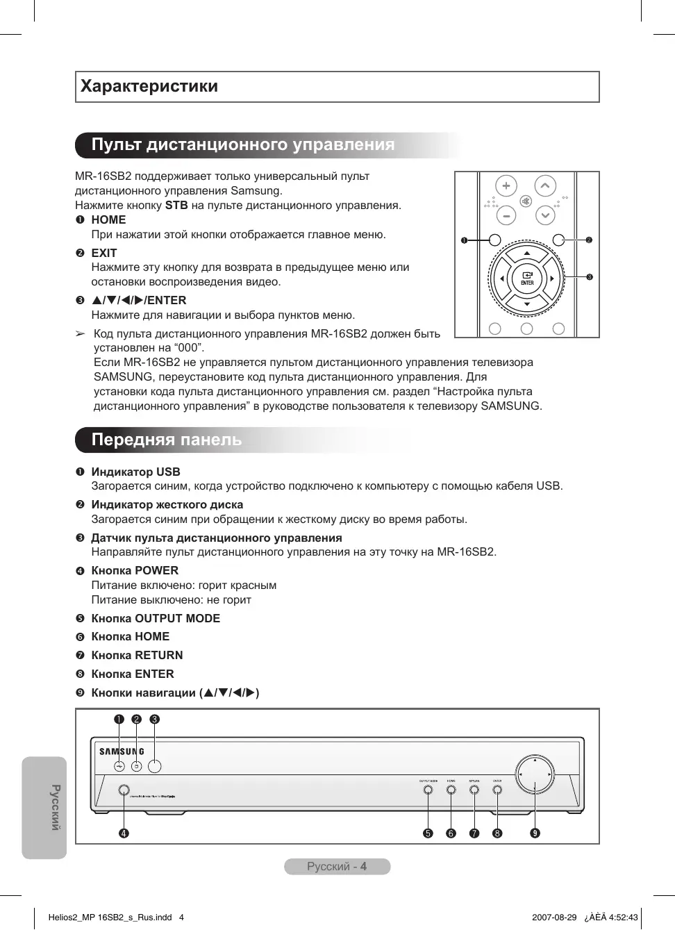 Характеристики Пульт дистанционного управления MR-16SB2 поддерживает только универсальный пульт дистанционного управления Samsung. Нажмите кнопку STB на пульте дистанционного управления. HOME При нажатии этой кнопки отображается главное меню. EXIT Нажмите эту кнопку для возврата в предыдущее меню или остановки воспроизведения видео. ////ENTER Нажмите для навигации и выбора пунктов меню. ➢ Код пульта дистанционного управления MR-16SB2 должен быть установлен на “000”. Если MR-16SB2 не управляется пультом дистанционного управления телевизора SAMSUNG, переустановите код пульта дистанционного управления. Для установки кода пульта дистанционного управления см. раздел “Настройка пульта дистанционного управления” в руководстве пользователя к телевизору SAMSUNG.