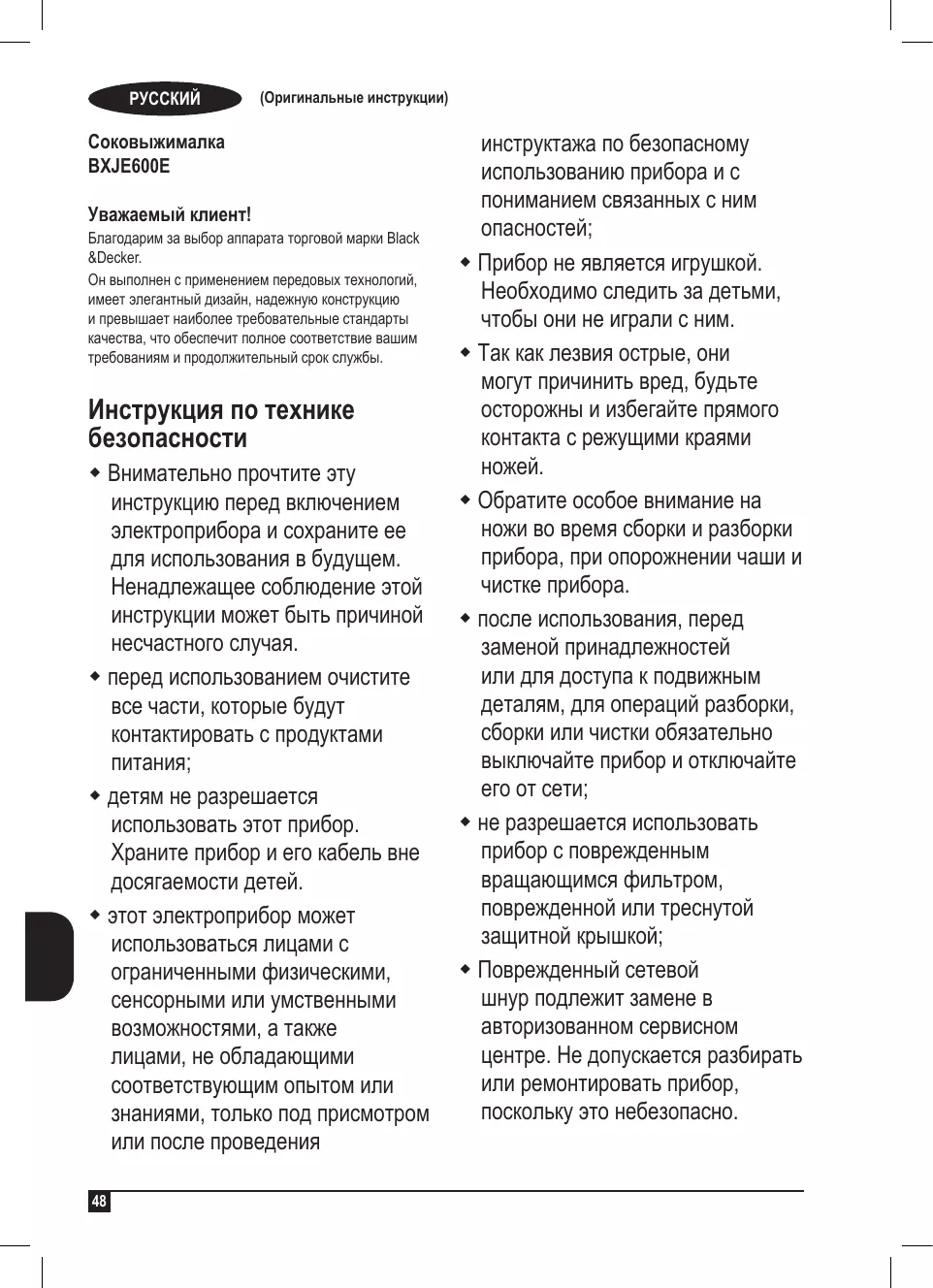 (Оригинальные инструкции) Соковыжималка BXJE600E Уважаемый клиент! Благодарим за выбор аппарата торговой марки Black &Decker. Он выполнен с применением передовых технологий, имеет элегантный дизайн, надежную конструкцию и превышает наиболее требовательные стандарты качества, что обеспечит полное соответствие вашим требованиям и продолжительный срок службы. Инструкция по технике безопасности Внимательно прочтите эту инструкцию перед включением электроприбора и сохраните ее для использования в будущем. Ненадлежащее соблюдение этой инструкции может быть причиной несчастного случая. перед использованием очистите все части, которые будут контактировать с продуктами детям не разрешается использовать этот прибор. Храните прибор и его кабель вне досягаемости детей. этот электроприбор может использоваться лицами с ограниченными физическими, сенсорными или умственными возможностями, а также лицами, не обладающими соответствующим опытом или знаниями, только под присмотром или после проведения
