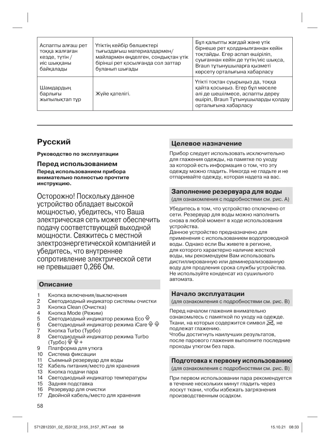 Это считается нормальным явлением и прекратится после нескольких раз использования утюга. Если дым/запах не устраняется после выключения и охлаждения устройства, обратитесь в авторизованную сервисную службу компании Braun.