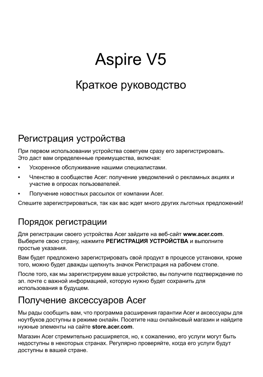 Получение новостных рассылок от компании Acer. Спешите зарегистрироваться, так как вас ждет много других льготных предложений! Порядок регистрации Для регистрации своего устройства Acer зайдите на веб-сайт www.acer.com. Выберите свою страну, нажмите РЕГИСТРАЦИЯ УСТРОЙСТВА и выполните простые указания. Вам будет предложено зарегистрировать свой продукт в процессе установки, кроме того, можно будет дважды щелкнуть значок Регистрация на рабочем столе. После того, как мы зарегистрируем ваше устройство, вы получите подтверждение по эл. почте с важной информацией, которую нужно будет сохранить для использования в будущем. Получение аксессуаров Acer Мы рады сообщить вам, что программа расширения гарантии Acer и аксессуары для ноутбуков доступны в режиме онлайн. Посетите наш онлайновый магазин и найдите нужные элементы на сайте store.acer.com. Магазин Acer стремительно расширяется, но, к сожалению, его услуги могут быть недоступны в некоторых странах. Регулярно проверяйте, когда его услуги будут доступны в вашей стране. © 2012 Все права защищены. Краткое руководство по компьютеру Aspire V5 Эта редакция: 12/2012 Номер модели: ________________________________ Серийный номер: ______________________________ Дата покупки: _________________________________ Место покупки: ________________________________