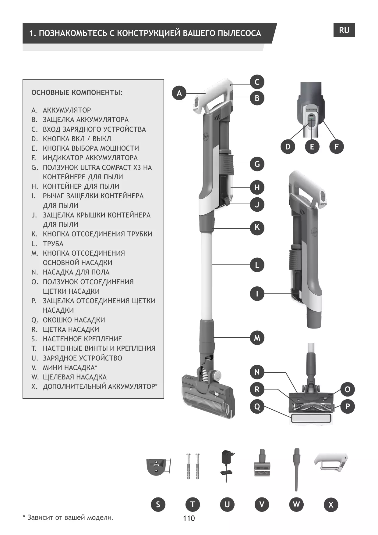 J. BOTÃO DE ABERTURA DO DEPÓSITO DE PÓ VAZIO K. BOTÃO DE ABERTURA DO TUBO L. TUBO M. BOTÃO DE LIBERTAÇÃO DA ESCOVA N. ESCOVA DE PAVIMENTOS O. CURSOR DE LIBERTAÇÃO DA BARRA DA ESCOVA DO BOCAL P. TRANCA DE LIBERTAÇÃO DA ESCOVA ROTATIVA DA ESCOVA Q. JANELA DA ESCOVA R. ESCOVA ROTATIVA S. SUPORTE DE PAREDE T. PARAFUSOS E FIXAÇÕES PARA MONTAGEM NA PAREDE U. CARREGADOR V. MINI ESCOVA ELÉTRICA* W. ACESSÓRIO PARA FENDAS X. PACOTE DE BATERIA ADICIONAL*