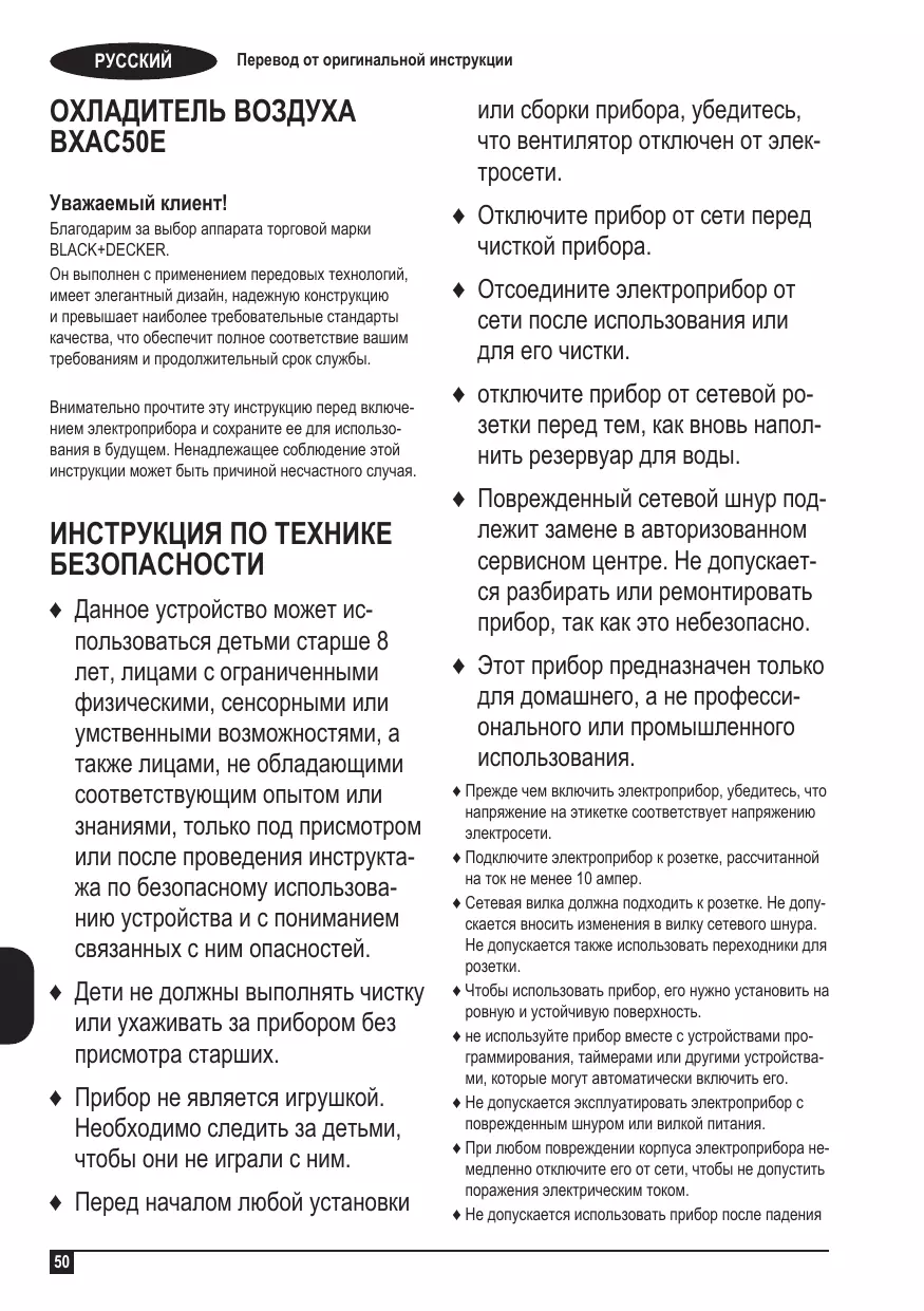 ИНСТРУКЦИЯ ПО ТЕХНИКЕ БЕЗОПАСНОСТИ ♦ Данное устройство может использоваться детьми старше 8 лет, лицами с ограниченными физическими, сенсорными или умственными возможностями, а также лицами, не обладающими соответствующим опытом или знаниями, только под присмотром или после проведения инструктажа по безопасному использованию устройства и с пониманием связанных с ним опасностей. ♦ Дети не должны выполнять чистку или ухаживать за прибором без присмотра старших. ♦ Прибор не является игрушкой. Необходимо следить за детьми, чтобы они не играли с ним. ♦ Перед началом любой установки 50