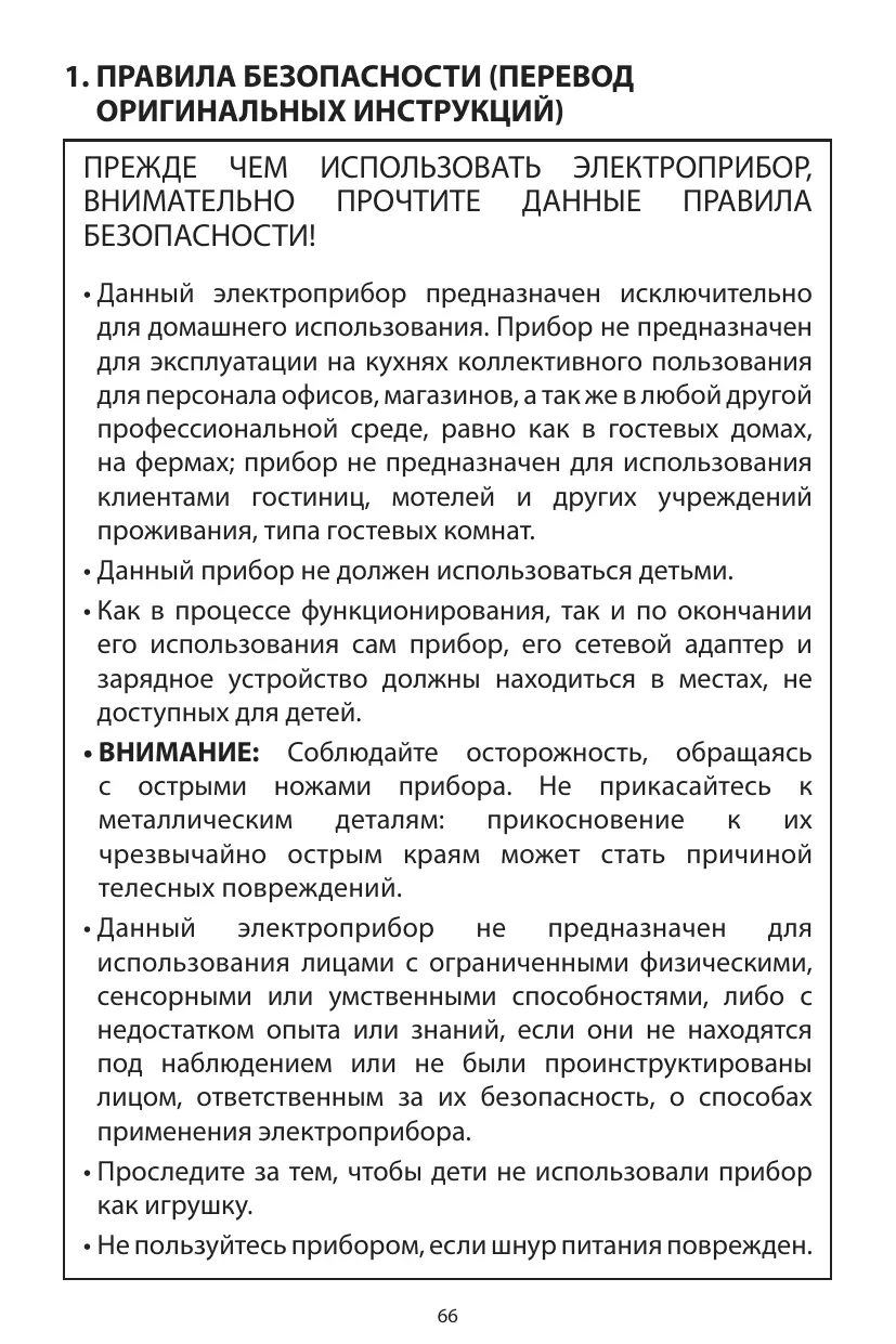 • L’appareil est destiné à un usage domestique seulement et n’est pas destiné à être utilisé dans des applications telles que : les cuisines du personnel dans les magasins, les bureaux et autres environnements de travail ; les fermes ; par les clients d’hôtels, de motels et d’autres environnements de type résidentiel ; les établissements de type chambres d’hôtes. • Cet appareil ne doit pas être utilisé par des enfants. • Garder l’appareil, l’adaptateur secteur et la base de chargement hors de portée des enfants pendant et après leur utilisation. • ATTENTION : Être prudent lorsque vous manipuler les lames tranchantes et procéder au nettoyage. Ne pas toucher les lames métalliques. Elles sont toutes extrêmement tranchantes et un contact peut entraîner des blessures. • Cet appareil n’est pas destiné à être utilisé par des personnes ayant des capacités physiques, sensorielles ou mentales réduites ou un manque d’expérience et de connaissances, à moins qu’elles soient sous surveillance ou aient été informées de la manière de l’utiliser par une personne responsable de leur sécurité. • Surveiller les enfants afin de vous assurer qu’ils ne jouent pas avec ce produit. • Ne pas utiliser l’appareil si le câble est endommagé. • Si le câble est endommagé, cesser immédiatement d’utiliser l’appareil. Si le câble est endommagé, le fabricant doit le remplacer. Aucune réparation ne doit être effectuée par le client. • Avant la première utilisation et après chaque utilisation, nettoyer soigneusement chaque pièce. 1