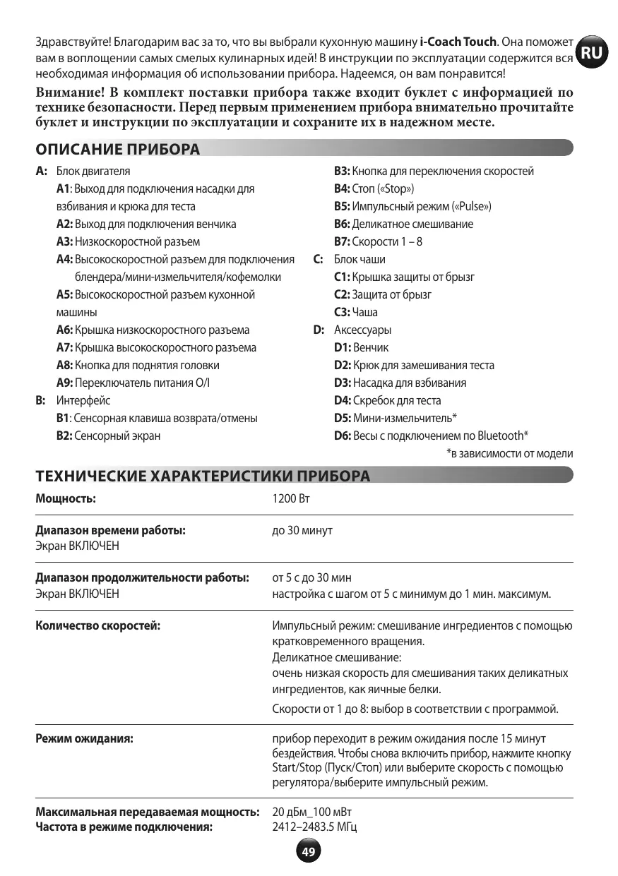 Здравствуйте! Благодарим вас за то, что вы выбрали кухонную машину i-Coach Touch. Она поможет вам в воплощении самых смелых кулинарных идей! В инструкции по эксплуатации содержится вся необходимая информация об использовании прибора. Надеемся, он вам понравится!