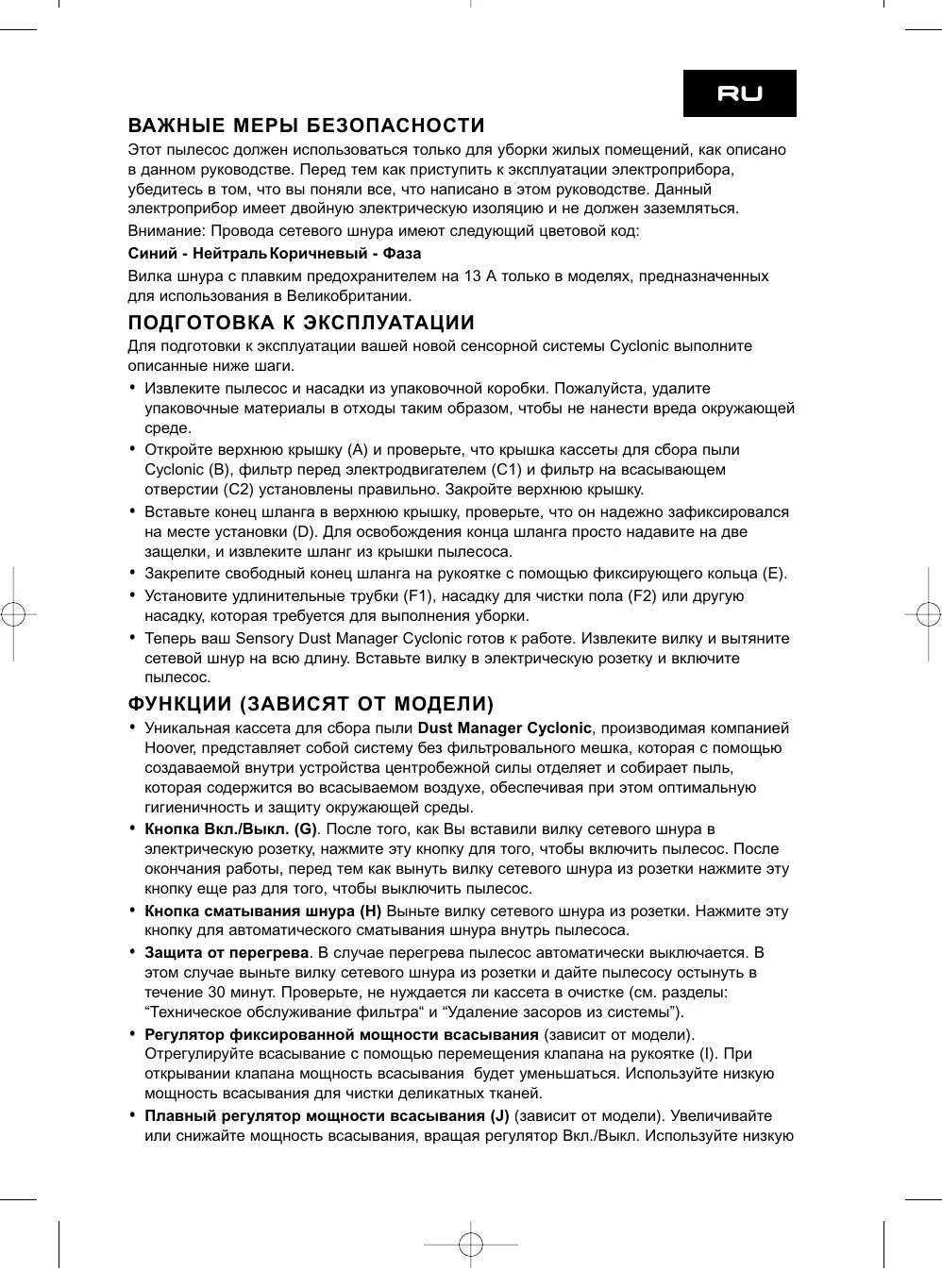 RU ВАЖНЫЕ МЕРЫ БЕЗОПАСНОСТИ Этот пылесос должен использоваться только для уборки жилых помещений, как описано в данном руководстве. Перед тем как приступить к эксплуатации электроприбора, убедитесь в том, что вы поняли все, что написано в этом руководстве. Данный электроприбор имеет двойную электрическую изоляцию и не должен заземляться. Внимание: Провода сетевого шнура имеют следующий цветовой код: Синий - Нейтраль Коричневый - Фаза Вилка шнура с плавким предохранителем на 13 А только в моделях, предназначенных для использования в Великобритании.