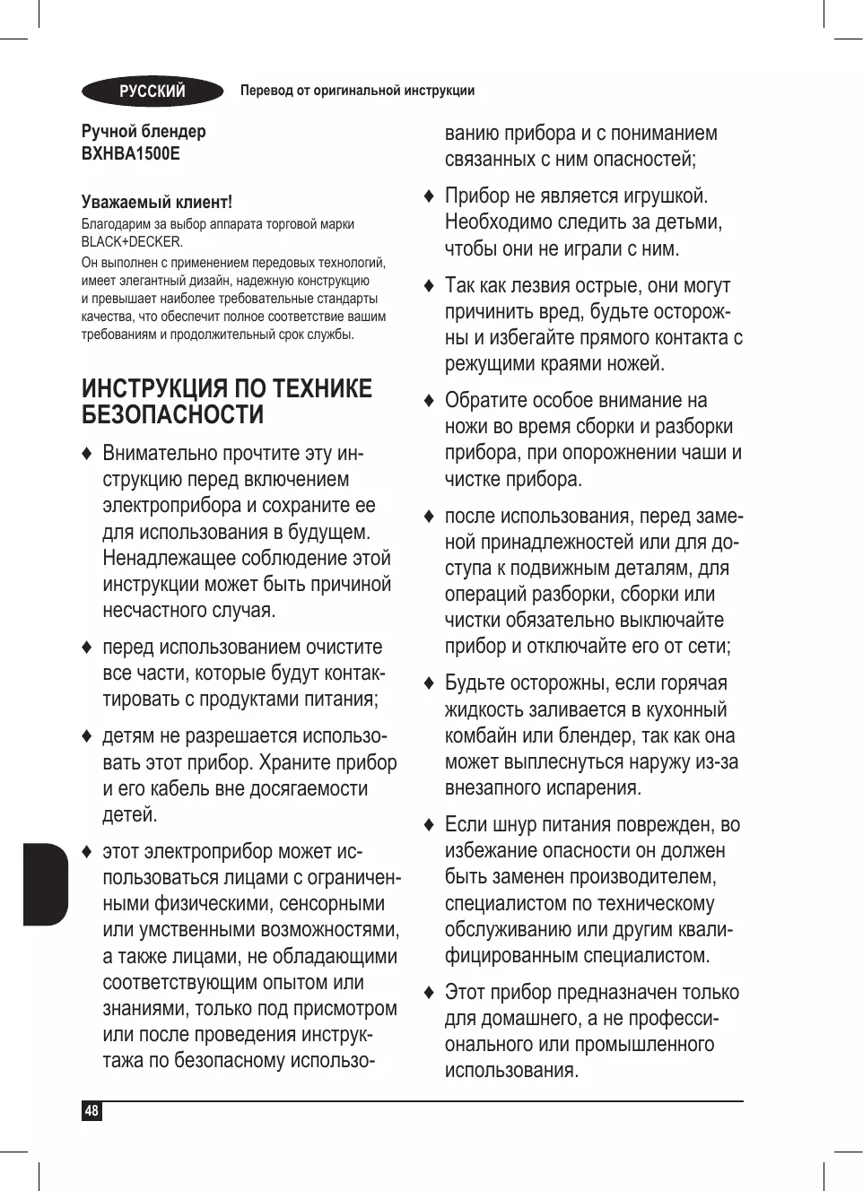 Перевод от оригинальной инструкции Ручной блендер BXHBA1500E Уважаемый клиент! Благодарим за выбор аппарата торговой марки BLACK+DECKER. Он выполнен с применением передовых технологий, имеет элегантный дизайн, надежную конструкцию и превышает наиболее требовательные стандарты качества, что обеспечит полное соответствие вашим требованиям и продолжительный срок службы. ИНСТРУКЦИЯ ПО ТЕХНИКЕ БЕЗОПАСНОСТИ ♦♦ Внимательно прочтите эту инструкцию перед включением электроприбора и сохраните ее для использования в будущем. Ненадлежащее соблюдение этой инструкции может быть причиной несчастного случая. ♦♦ перед использованием очистите все части, которые будут контактировать с продуктами питания; ♦♦ детям не разрешается использовать этот прибор. Храните прибор и его кабель вне досягаемости ♦♦ этот электроприбор может использоваться лицами с ограниченными физическими, сенсорными или умственными возможностями, а также лицами, не обладающими соответствующим опытом или знаниями, только под присмотром или после проведения инструктажа по безопасному использо48 ванию прибора и с пониманием связанных с ним опасностей; ♦♦ Прибор не является игрушкой. Необходимо следить за детьми, чтобы они не играли с ним. ♦♦ Так как лезвия острые, они могут причинить вред, будьте осторожны и избегайте прямого контакта с режущими краями ножей. ♦♦ Обратите особое внимание на ножи во время сборки и разборки прибора, при опорожнении чаши и чистке прибора. ♦♦ после использования, перед заменой принадлежностей или для доступа к подвижным деталям, для операций разборки, сборки или чистки обязательно выключайте прибор и отключайте его от сети; ♦♦ Будьте осторожны, если горячая жидкость заливается в кухонный комбайн или блендер, так как она может выплеснуться наружу из-за внезапного испарения. ♦♦ Если шнур питания поврежден, во избежание опасности он должен быть заменен производителем, специалистом по техническому обслуживанию или другим квалифицированным специалистом. ♦♦ Этот прибор предназначен только для домашнего, а не профессионального или промышленного использования. Перевод от оригинальной инструкции ♦♦Прежде чем включить электроприбор, убедитесь, что напряжение на этикетке соответствует напряжению электросети. ♦♦Подключите электроприбор к розетке, рассчитанной на ток не менее 10 ампер. ♦♦Сетевая вилка должна подходить к розетке. Не допускается вносить изменения в вилку сетевого шнура. Не допускается также использовать переходники для ♦♦рабочее место, где используется прибор, должно быть чистым и хорошо освещенным. Беспорядок и недостаточное освещение могут стать причиной несчастного случая. ♦♦во время использования прибор должен быть недоступен для детей и посторонних лиц. ♦♦не допускается эксплуатировать электроприбор с поврежденным шнуром или вилкой питания. ♦♦при любом повреждении корпуса электроприбора немедленно отключите его от сети, чтобы не допустить поражения электрическим током; ♦♦Не допускается использовать прибор после падения на пол, если на нем имеются видимые следы повреждений или протечка. ♦♦Не используйте прибор, если ваши руки или ноги влажные, а также босиком; ♦♦Не тяните за шнур питания. Не допускается использовать шнур питания, чтобы поднимать или переносить электроприбор, вынимать вилку из