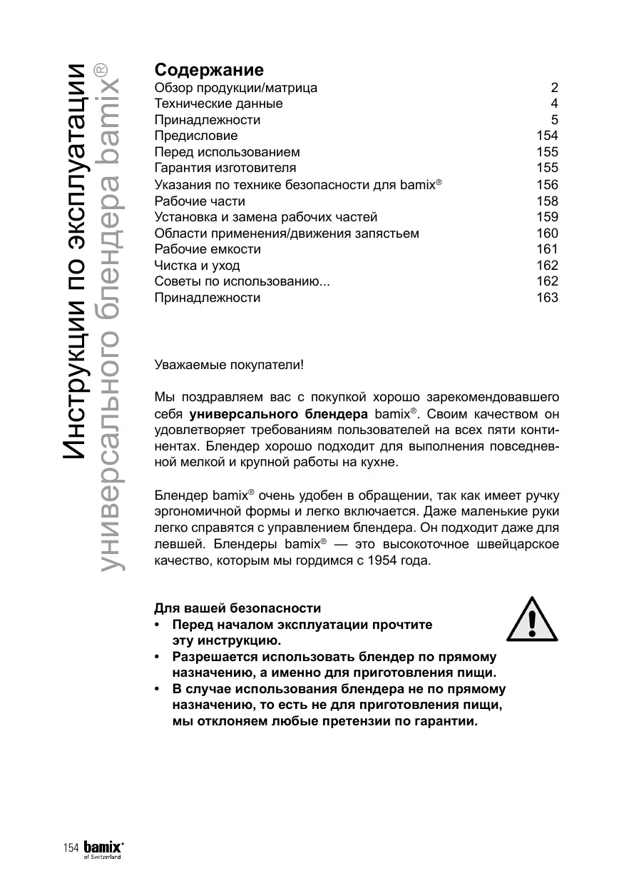 • Lorsque l‘appareil est laissé sans surveillance ou avant son installation, son démontage ou son nettoyage, il faut toujours le débrancher • Ne pas poser l’appareil sur des surfaces chaudes ou à proximité de flammes de gaz, pour éviter que le boîtier ne fonde • L’appareil ne doit être plongé dans un liquide que jusqu’au-dessous de la séparation de la poignée et du boîtier • L’appareil et le capot de protection ne doivent pas être nettoyés dans un lave-vaisselle • Nettoyer l’appareil seulement avec un chiffon humide • Retirez la prise secteur lorsque vous manipulez la coupole de protection ou les accessoires pour nettoyer l’appareil sous l’eau courante ou pour changer un accessoire • N’enclenchez l’appareil qu’après avoir plongé le tube dans le récipient de travail • Le bamix® est doté d’un interrupteur de sécurité prévenant toute mise en service intempestive, et qui arrête instantanément l’appareil dès qu’il est relâché • Si le cable de cet appareil est endommagée, elle devra être remplacée par le fabricant ou son service après-vente ou par une personne possédant des qualifications équivalentes pour éviter tout danger • Débrancher la prise secteur en cas de dérangement lors de l‘utilisation et après l’utilisation • Ne retirez jamais la fiche secteur hors de la prise lorsque vous avez les mains mouillées • Ne porter ni ne tirer jamais l’appareil par son cordon • Le cordon secteur ne doit pas reposer sur des arêtes tranchantes ni être pincé • Evitez de placer le cordon sur des objets chauds ou à proximité de flammes de gaz, et protégez-le de la chaleur et de l’huile • Ne mettez jamais l’appareil en service quand: – l’appareil, son boîtier ou son cordon secteur sont endommagés, – au moindre soupçon de défaut après une chute ou autre circonstance similaire. Dans ce cas, confier l’appareil à notre service de réparation •