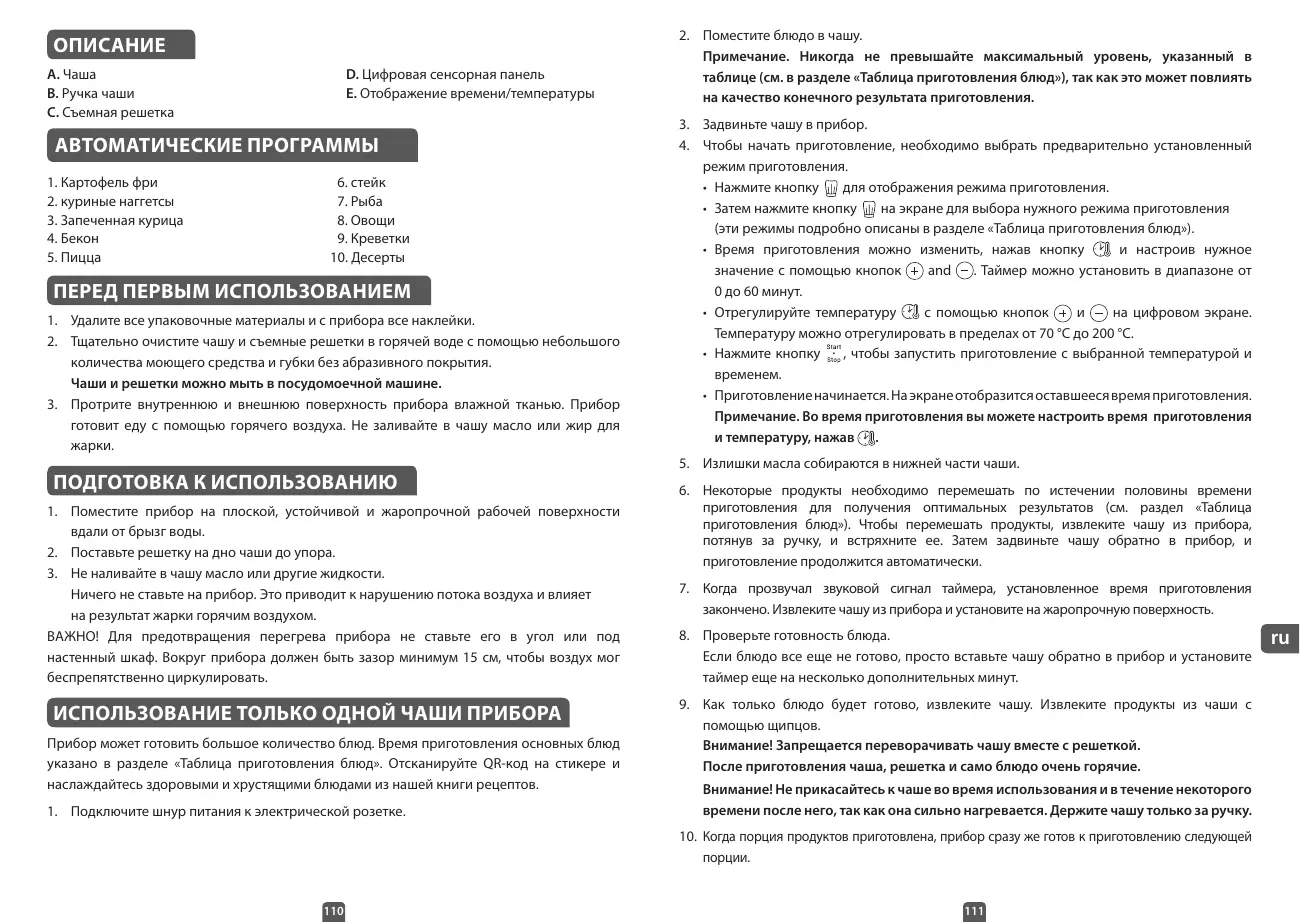 MODE D’EMPLOI DE L’APPAREIL L’appareil permet de cuire une vaste gamme de recettes. Les temps de cuisson pour les principaux ingrédients sont indiqués dans la section « Réglages ». Savourez des plats sains et croustillants grâce à notre grande variété de recettes en flashant le code QR sur le sticker du produit.