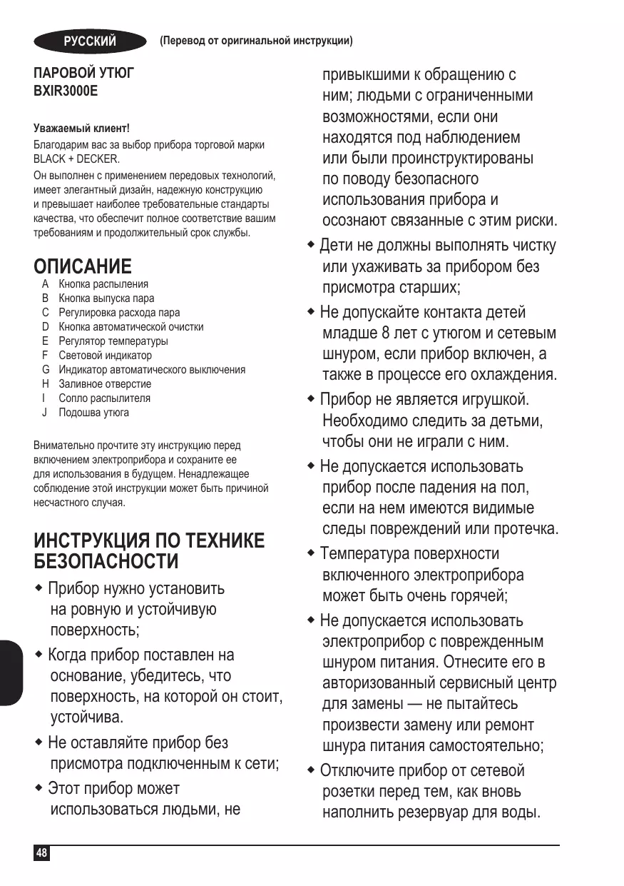 ПАРОВОЙ УТЮГ BXIR3000E Уважаемый клиент! Благодарим вас за выбор прибора торговой марки BLACK + DECKER. Он выполнен с применением передовых технологий, имеет элегантный дизайн, надежную конструкцию и превышает наиболее требовательные стандарты качества, что обеспечит полное соответствие вашим требованиям и продолжительный срок службы.