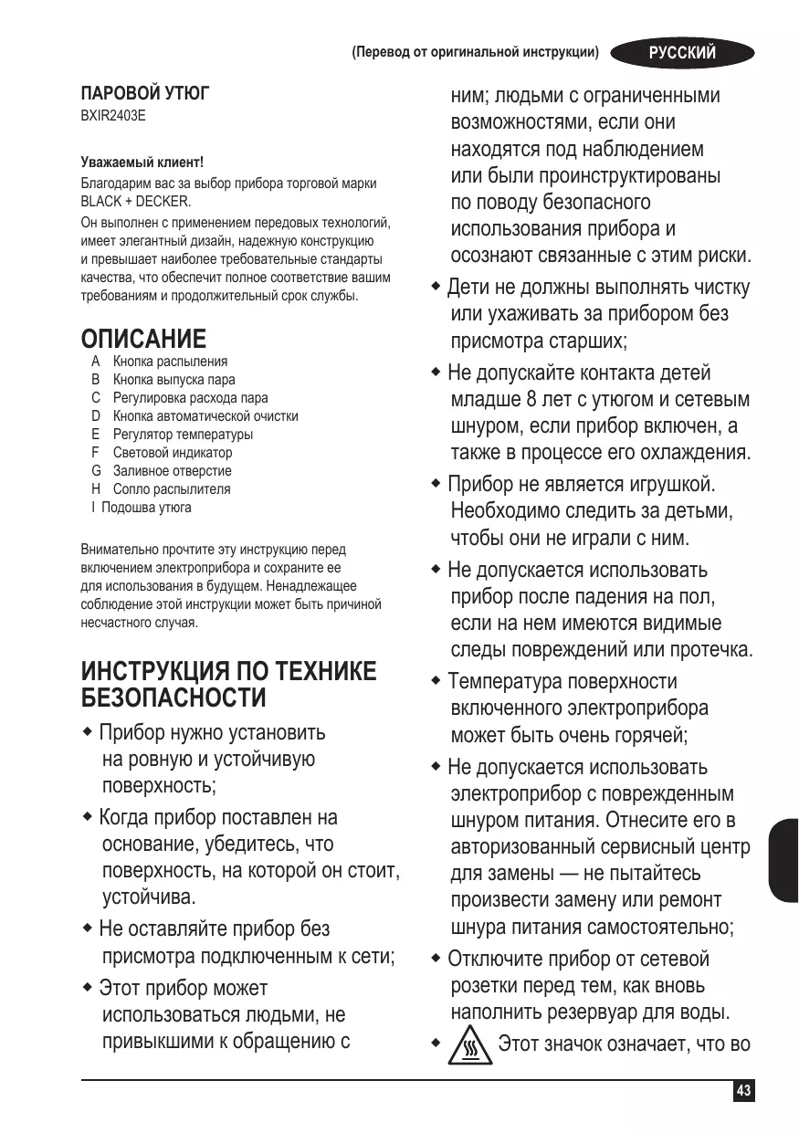 ним; людьми с ограниченными возможностями, если они находятся под наблюдением или были проинструктированы по поводу безопасного использования прибора и осознают связанные с этим риски. Дети не должны выполнять чистку или ухаживать за прибором без присмотра старших; Не допускайте контакта детей младше 8 лет с утюгом и сетевым шнуром, если прибор включен, а также в процессе его охлаждения. Прибор не является игрушкой. Необходимо следить за детьми, чтобы они не играли с ним. Не допускается использовать прибор после падения на пол, если на нем имеются видимые следы повреждений или протечка. Температура поверхности включенного электроприбора может быть очень горячей; Не допускается использовать электроприбор с поврежденным шнуром питания. Отнесите его в авторизованный сервисный центр для замены — не пытайтесь произвести замену или ремонт шнура питания самостоятельно; Отключите прибор от сетевой розетки перед тем, как вновь наполнить резервуар для воды. Этот значок означает, что во 43