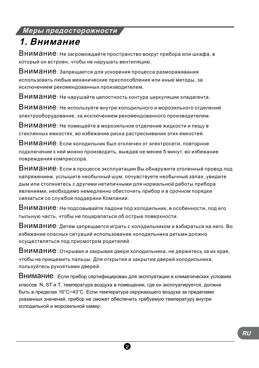 Предостережения : необходимо предпринять соответствующие меры в случае временного или продолжительного отключения холодильника (например, когда он стоит пустой, во время чистки, в случае открытой (-ых) двери(-ей) или крышки(-ек)). RU 4