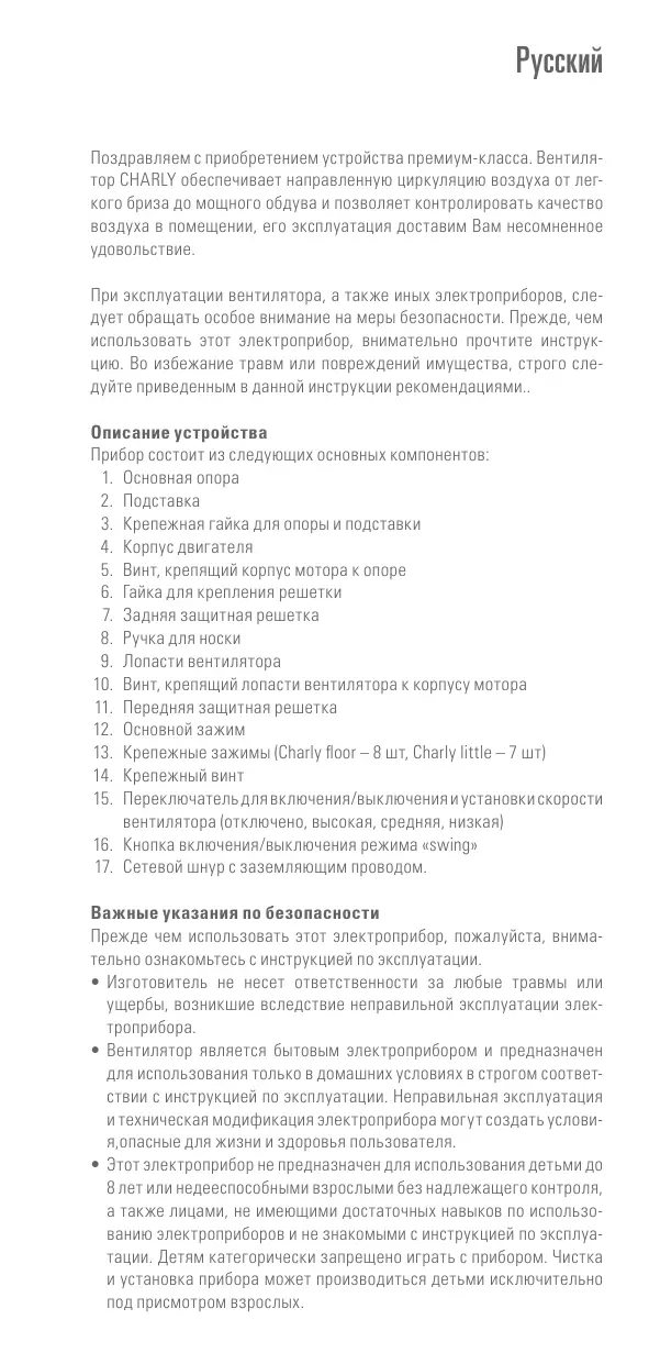 Félicitation! Vous venez d'acheter le superbe ventilateur CHARLY. Nous espérons que cet apparéil vous donnera entière satisfaction et améliorer a l'air interieur pour vous.