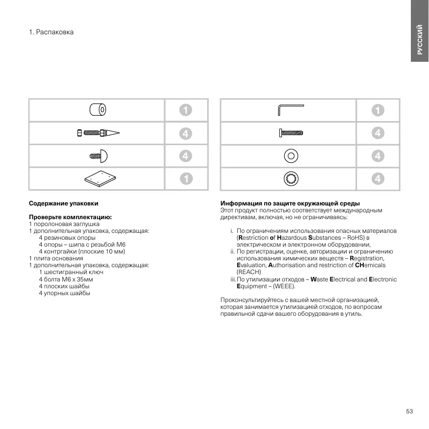4 pieds en caoutchouc 4 pieds-pointes M6 4 écrous de blocage (10 mm) 1 support de sol 1 carton d’accessoires contenant : équipements électriques et électroniques, ii. l’enregistrement, l’évaluation, l’autorisation et la restriction des substances chimiques (REACH) iii l’élimination des déchets électriques et électroniques (WEEE). Consultez votre organisme local d’élimination des déchets pour des conseils sur la façon appropriée de recycler ou de jeter ce produit.