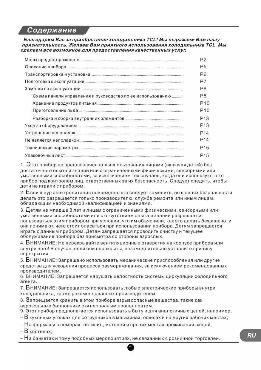 Содержание Благодарим Вас за приобретение холодильника TCL! Мы выражаем Вам нашу признательность. Желаем Вам приятного использования холодильника TCL. Мы сделаем все возможное для предоставления качественных услуг. Меры предосторожности Описание прибора Транспортировка и установка Подготовка к эксплуатации Заметки по эксплуатации Схема панели управления и руководство по ее использованию Хранение продуктов питания Приготовление льда Разборка и сборка внутренних элементов Уход за оборудованием