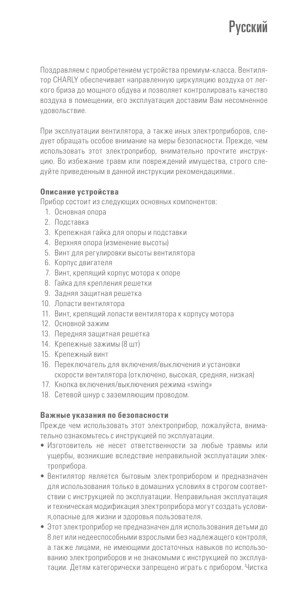 Поздравляем с приобретением устройства премиум-класса. Вентилятор CHARLY обеспечивает направленную циркуляцию воздуха от легкого бриза до мощного обдува и позволяет контролировать качество воздуха в помещении, его эксплуатация доставим Вам несомненное удовольствие. При эксплуатации вентилятора, а также иных электроприборов, следует обращать особое внимание на меры безопасности. Прежде, чем использовать этот электроприбор, внимательно прочтите инструкцию. Во избежание травм или повреждений имущества, строго следуйте приведенным в данной инструкции рекомендациями.. Описание устройства Прибор состоит из следующих основных компонентов: