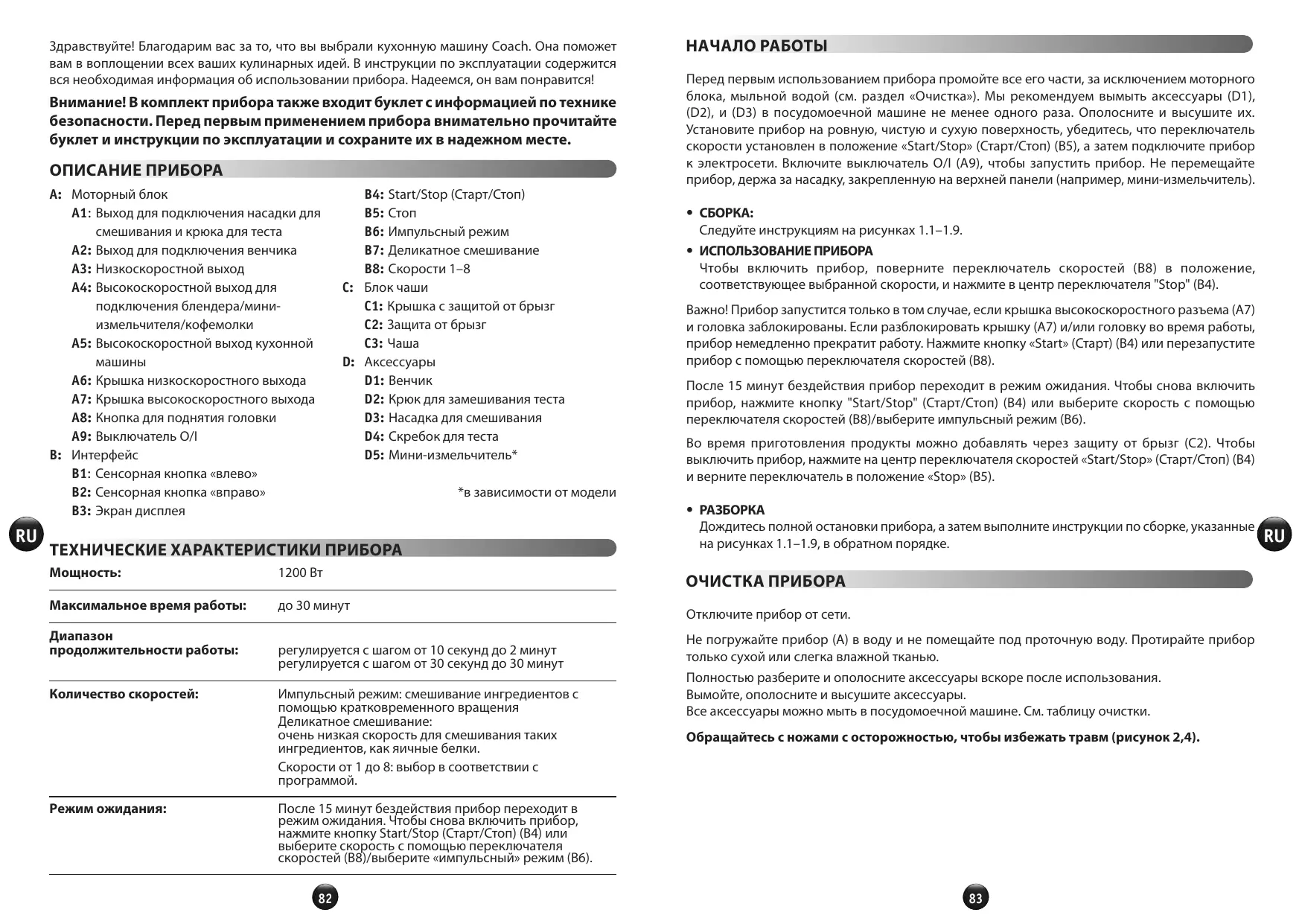 B5: Bouton d'arrêt B6: « Pulse » Placez votre appareil sur une surface plate, propre et sèche en vous assurant que le bouton de vitesses est en position « 0 » (B5). Appuyez sur le bouton O/I (A9) pour démarrer votre appareil. Ne le déplacez jamais en le portant par un accessoire fixé sur le haut (par exemple, le mini—hachoir).