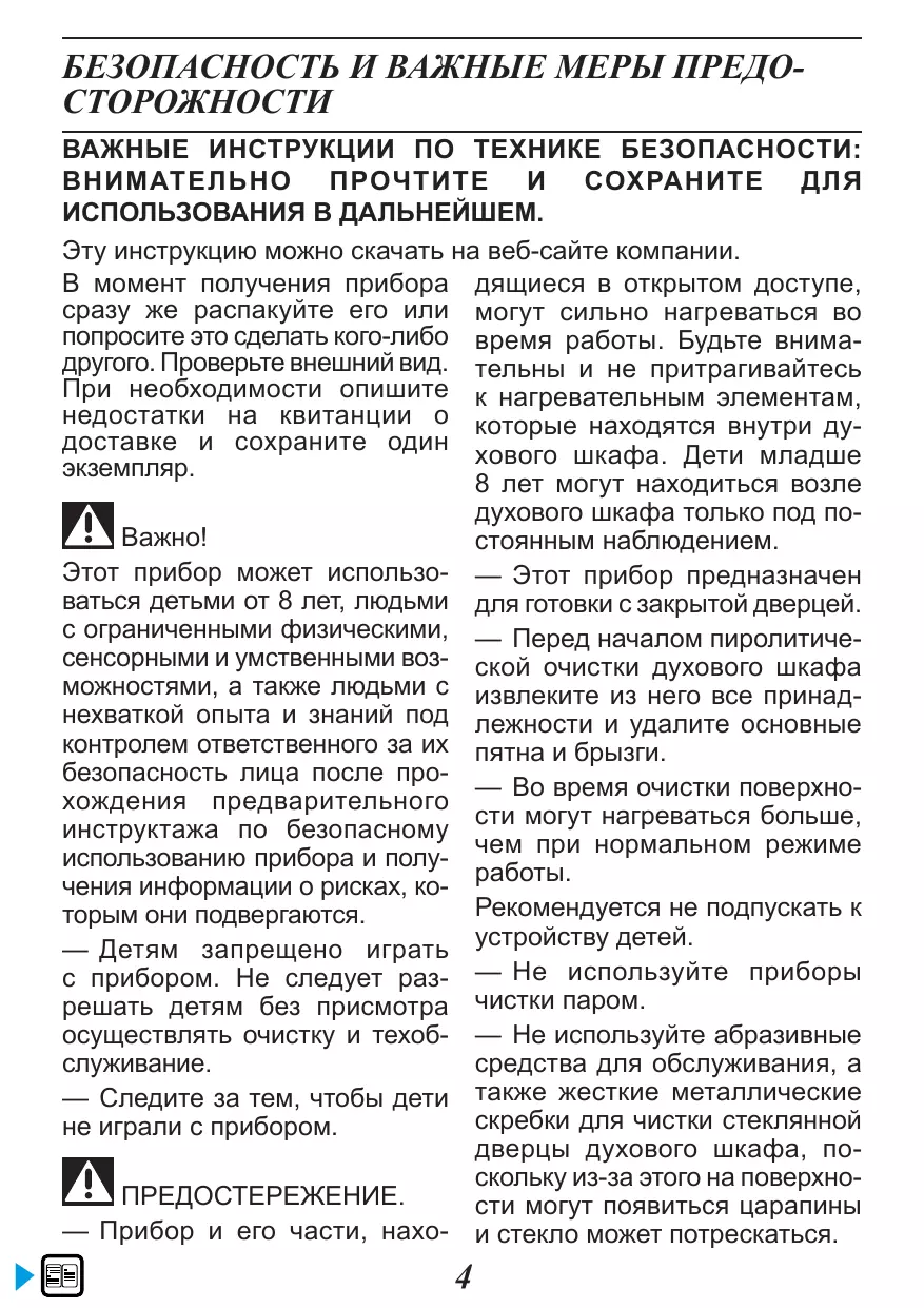 — Cet appareil est conçu pour faire des cuissons porte fermée. Important : Cet appareil peut être utilisé par — Avant de procéder à un nettoyage des enfants âgés de 8 ans et pyrolyse de votre four, retirez tous plus, et par des personnes aux les accessoires et enlevez les capacités physiques, sensorielles éclaboussures importantes. ou mentales réduites, ou dénuées — Dans la fonction de nettoyage, d’expérience et de connaissance, les surfaces peuvent devenir plus si elles ont pu bénéficier d’une chaudes qu’en usage normal. surveillance ou d’instructions Il est recommandé d’éloigner les préalables concernant l’utilisation enfants. de l’appareil de façon sûre et en ont — Ne pas utiliser d’appareil de compris les risques encourus. nettoyage à la vapeur. — Les enfants ne doivent pas jouer — Ne pas utiliser de produits avec l’appareil. Les opérations de d’entretien abrasifs ou de grattoirs nettoyage et de maintenance ne métalliques durs pour nettoyer doivent pas être faites par des la porte en verre du four, ce enfants laissés sans surveillance. qui pourrait érafler la surface et — Il convient de surveiller les entraîner l’éclatement du verre. enfants pour s’assurer qu’ils ne jouent pas avec l’appareil. MISE EN GARDE : — L’appareil et ses parties accessibles deviennent chaudes au