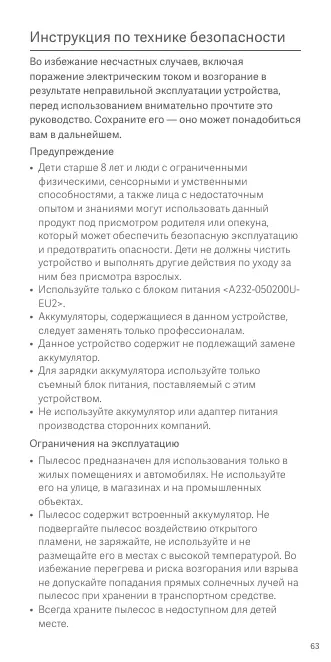 • Ce produit peut être utilisé par des enfants à partir de 8 ans, ainsi que des personnes présentant des déficiences physiques, sensorielles ou intellectuelles, ou dont l’expérience et les connaissances sont limitées sous le contrôle d’un parent ou d’un tuteur pour assurer une utilisation sécurisée et éviter tout danger. Le nettoyage et l’entretien ne doivent pas être effectués par des enfants sans surveillance. • N’utilisez que l’unité d’approvisionnement <A232050200U-EU2>. • Cet appareil contient des batteries ne pouvant être remplacées que par des personnes compétentes. • Ce produit contient des piles non remplaçables. • Pour charger la batterie, utilisez uniquement l'unité d'approvisionnement amovible fournie avec cet appareil. • N’utilisez pas de batterie, d’adaptateur d’alimentation ou de socle de charge tiers. Restrictions d’utilisation • L’aspirateur est destiné uniquement à être utilisé à domicile et dans un véhicule. Ne l’utilisez pas à l’extérieur, sous la pluie ni dans des environnements industriels. • L’aspirateur contient une batterie intégrée rechargeable. N’exposez pas l’aspirateur au feu et ne le chargez pas, ne l’utilisez pas ou ne l’entreposez pas dans un environnement à température élevée. Afin d’empêcher une surchauffe et un risque d'incendie ou d explosion, placez l’aspirateur à l’abri du soleil lorsqu'il est stocké dans un véhicule. • Gardez toujours l’aspirateur hors de la portée des enfants. • Afin d’éviter le risque de blessure, n’utilisez pas l’aspirateur avec les mains mouillées. 39